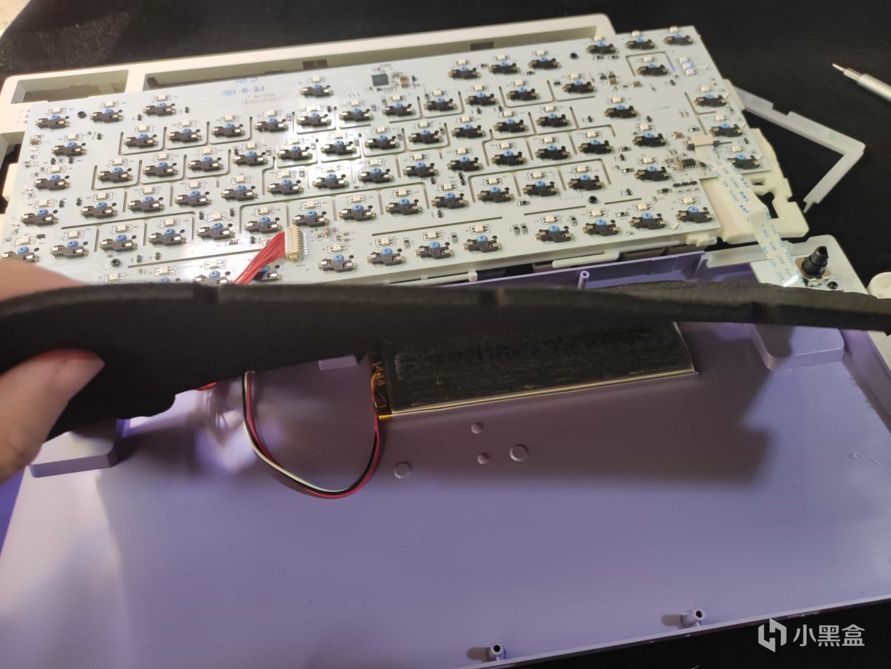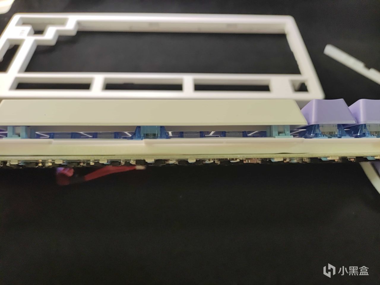 同时能看到键盘PCB板和定位板之间的两层消音结构。