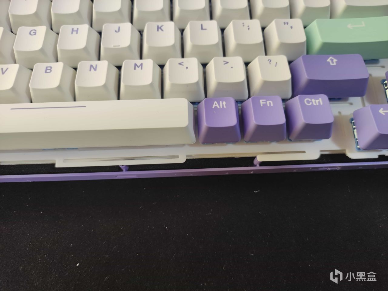 这款键盘的配列就是常规的方向键下沉的75配列,和之前个人开箱过的几款75配列键盘差别并不大,这款键盘声音的表现相比于板簧结构加上硅胶垫的vgn来说还是略有不足,但是对于我这种对于声音不是很在意的玩家来说完全够用,这款键盘个人比较推荐购买侧刻版本,看来群友的实拍图确实整体观感比这款绝绝紫的观感会好一些,并且价格也是一样的。