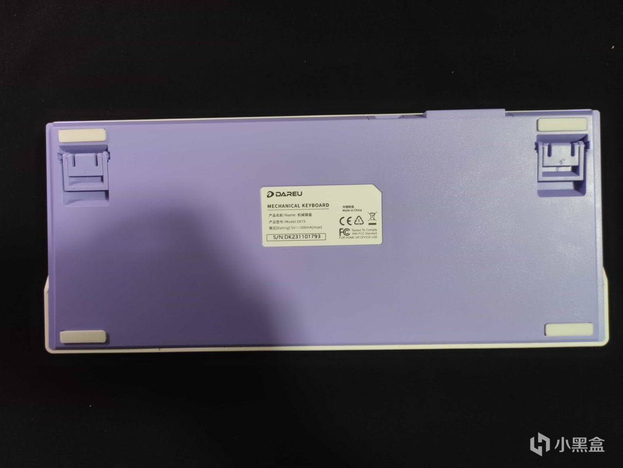 将视线转移到键盘的背面,其并没有整出什么新的花活,常规的双段式脚撑,但是后侧都是一个紫色的配色,和前侧白色为主的情况刚好相反。