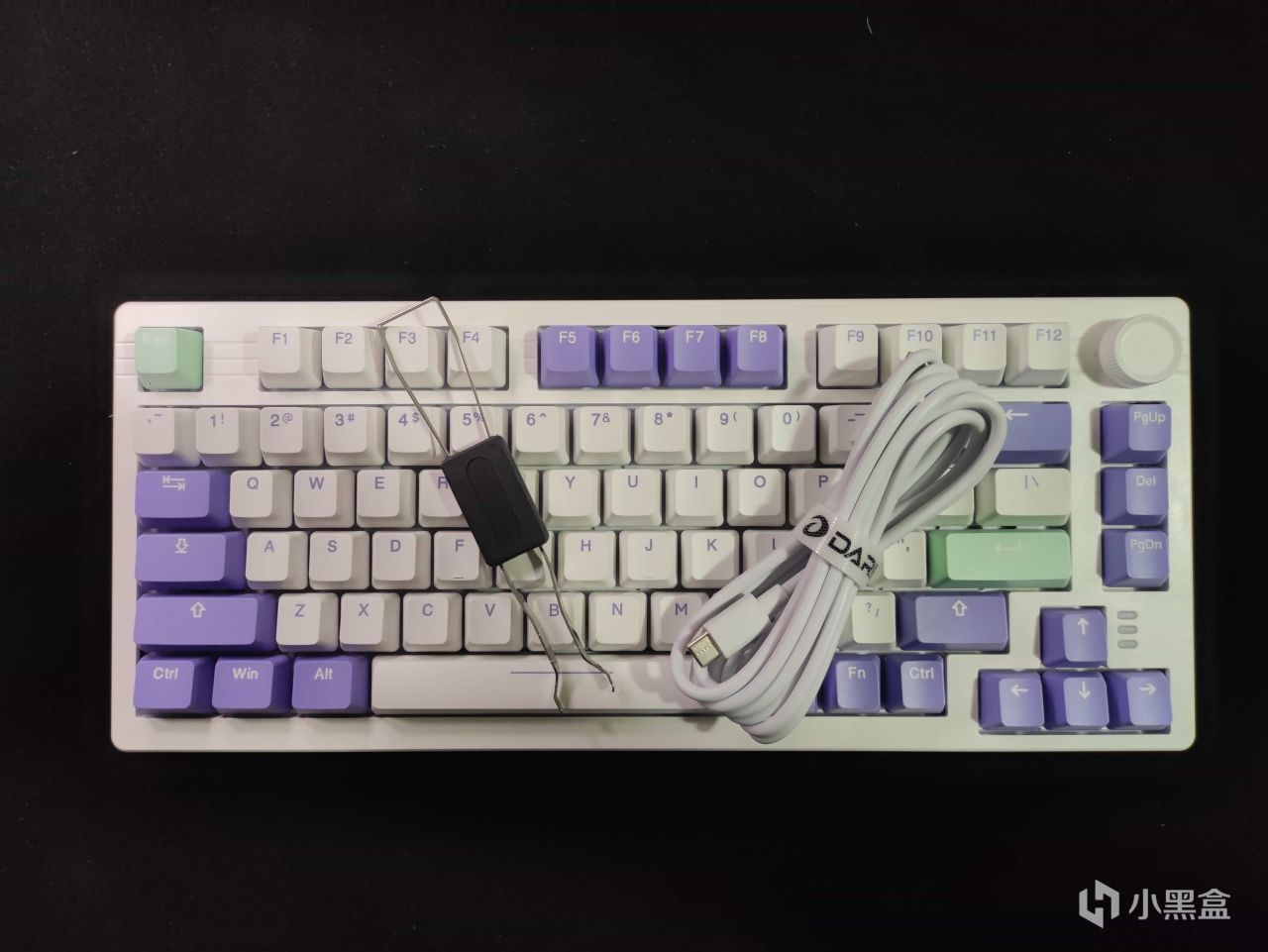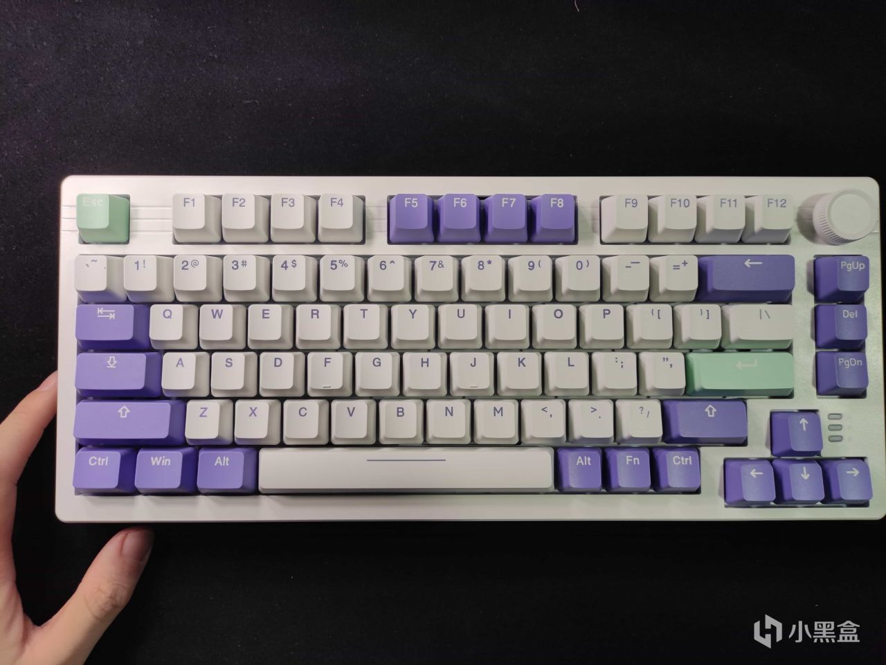 键盘的配列就是传统方向键下沉的75配列,强迫症再次绝望。但是左上角的旋钮和这款键盘的融合做的不错,突兀感并不强烈。