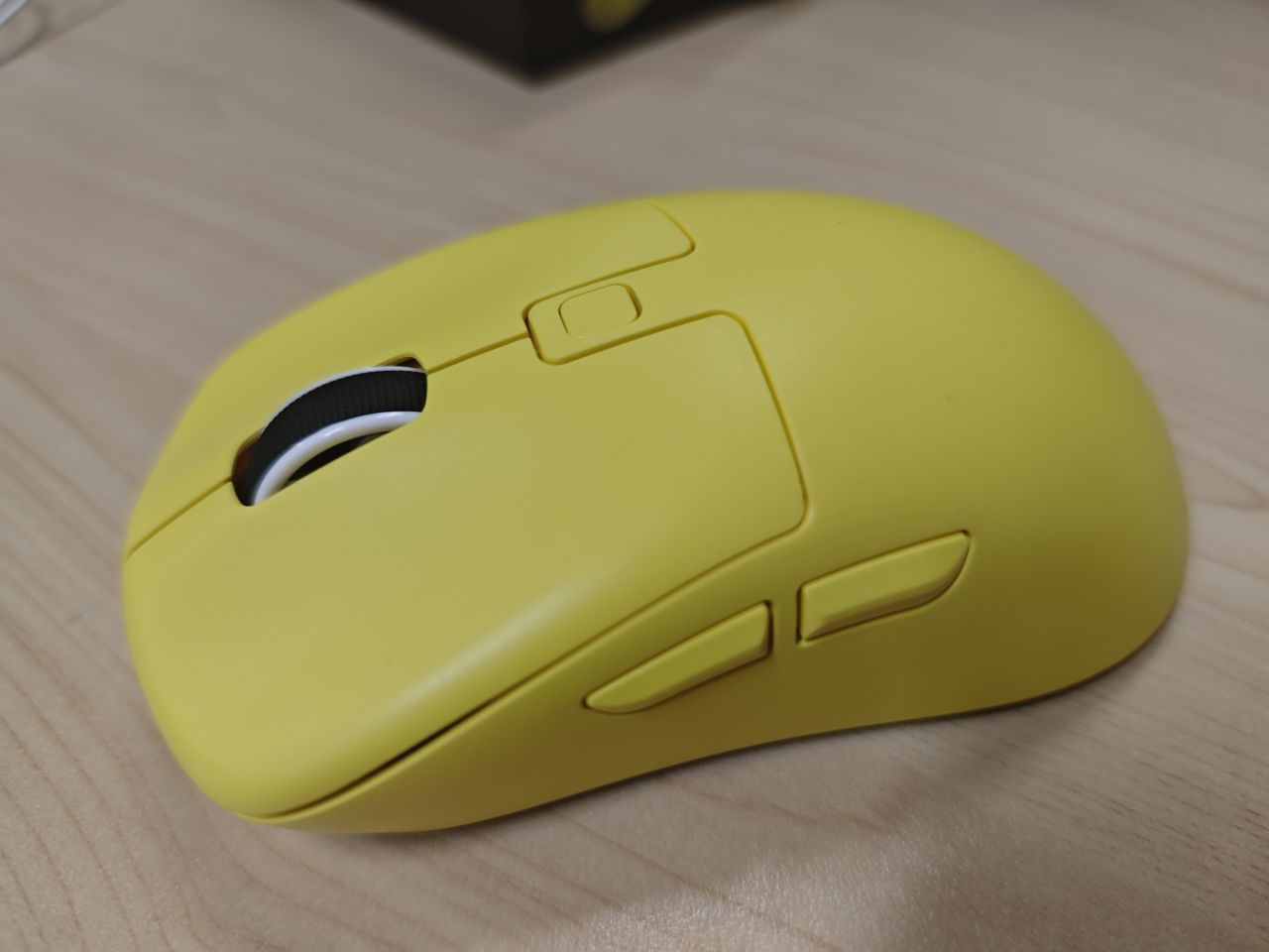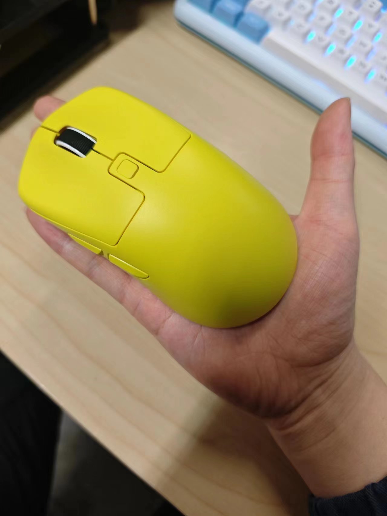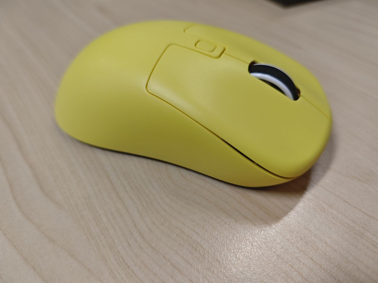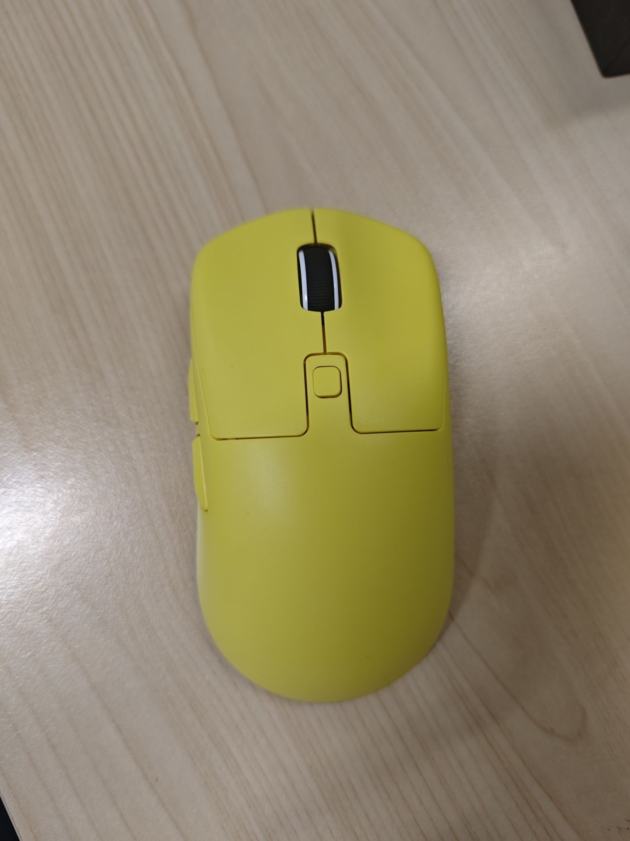 鼠标的上面外壳式纯黄色的,中间是DPI键,左侧有两个侧键。