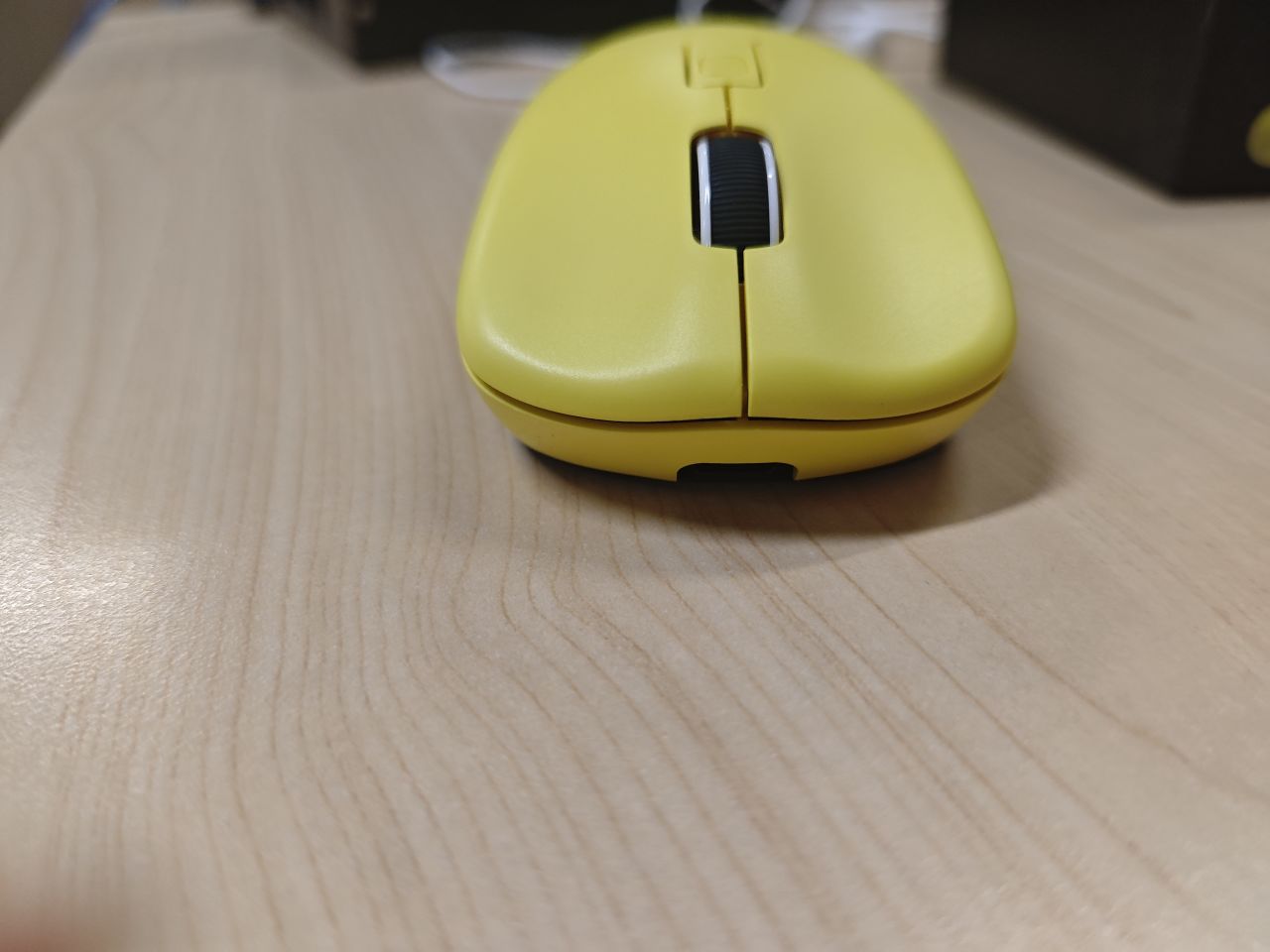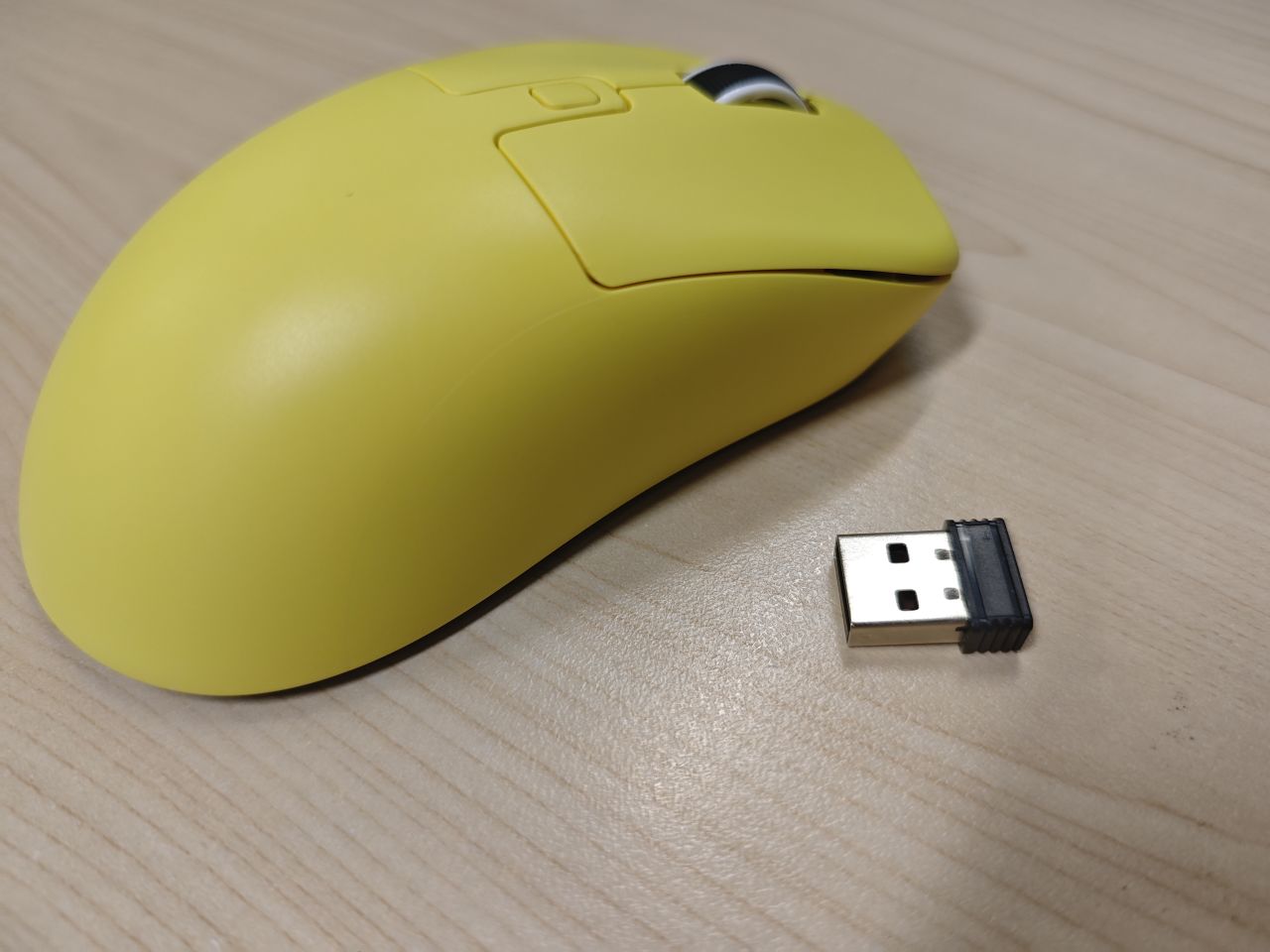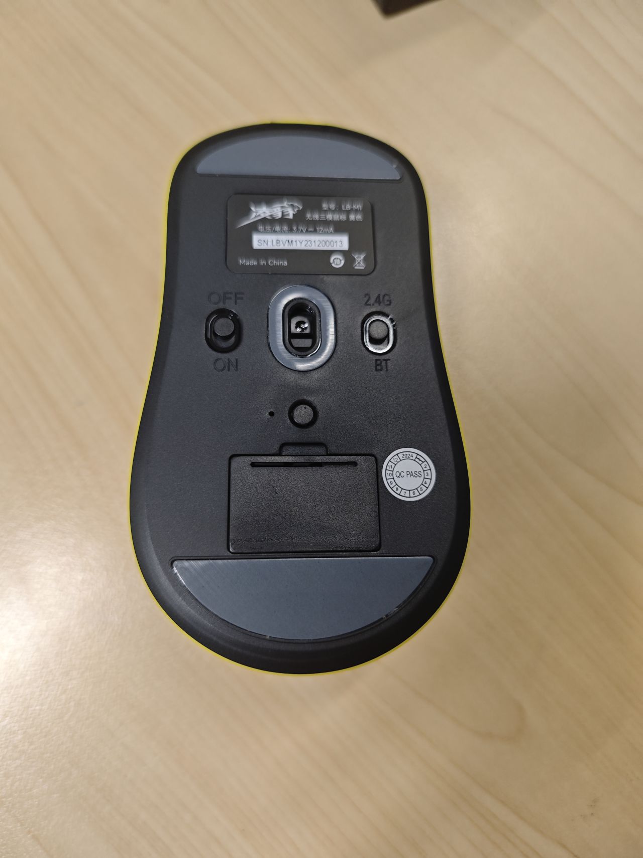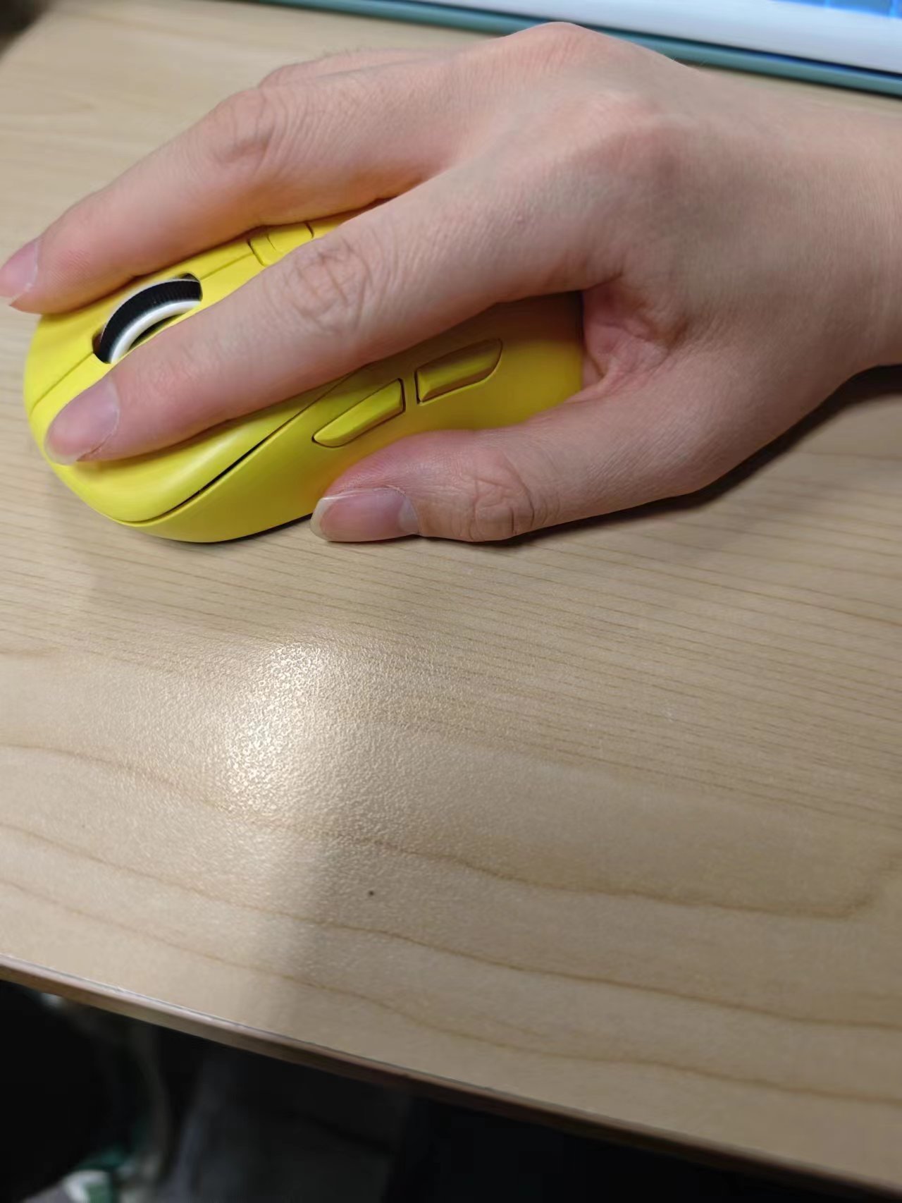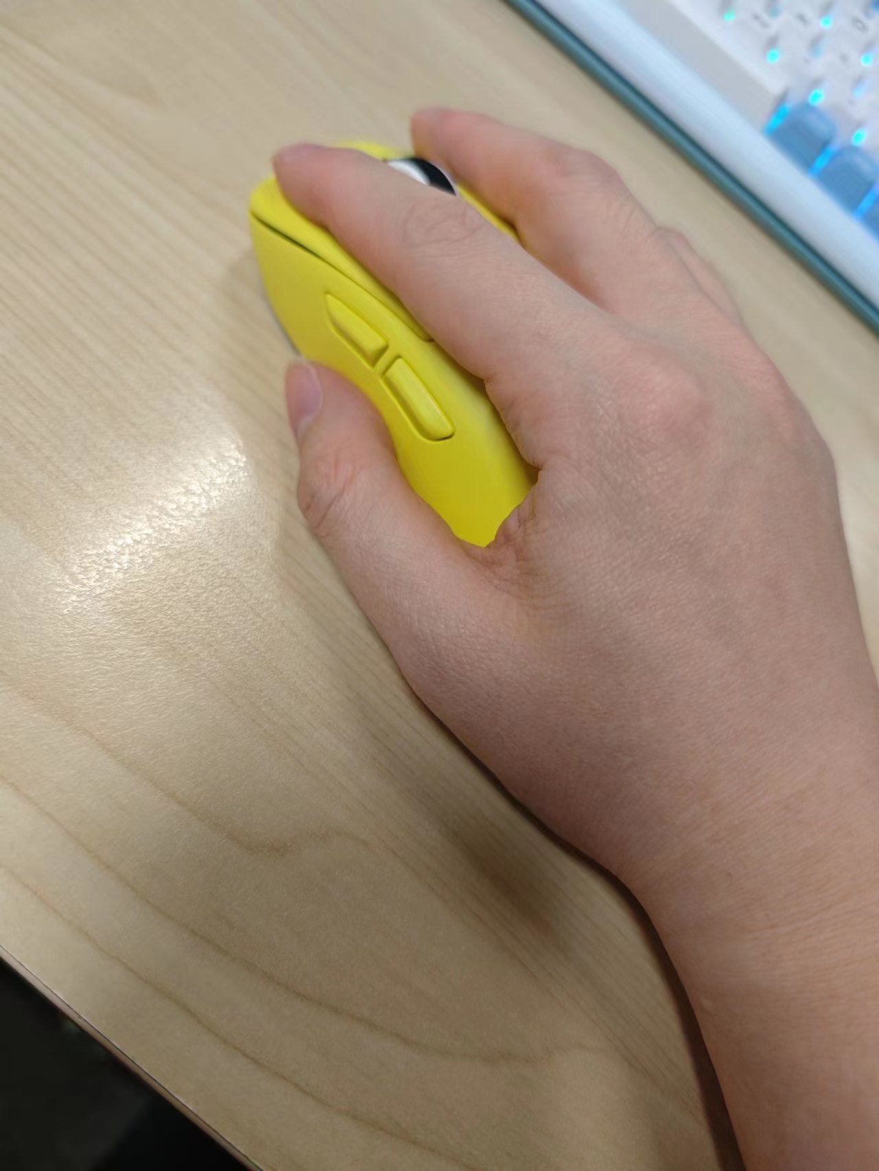 鼠标的上面外壳式纯黄色的,中间是DPI键,左侧有两个侧键。