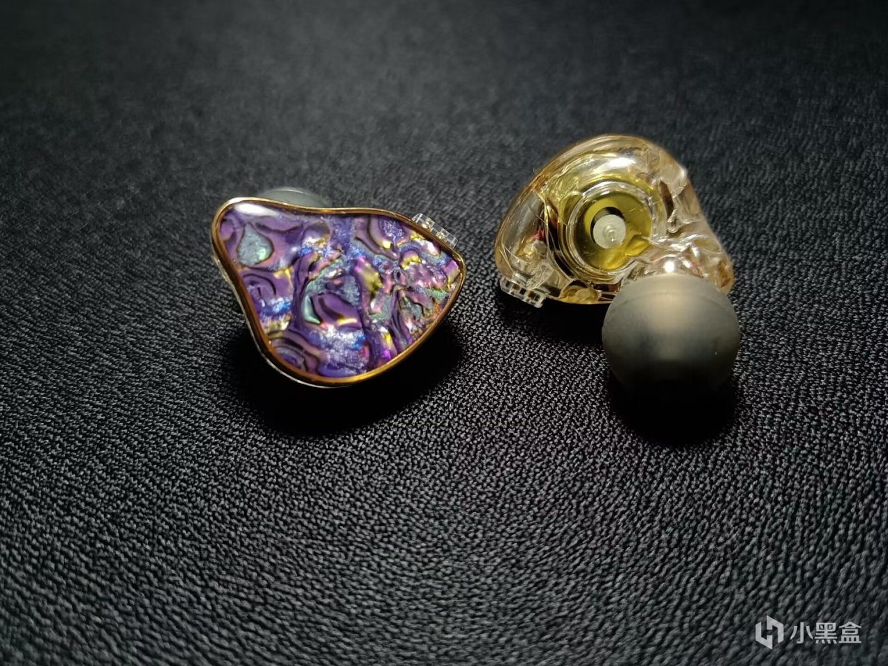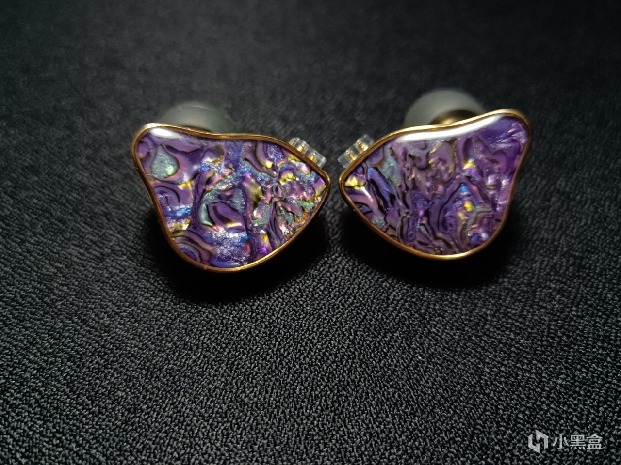首先就是腔体外观采用的是PC与铝合金面板相结合的方式,面板使用树脂滴胶工艺,搭配金属边框和PC底壳,呈现出一种类定制外形,将NX7和MK4耳机上的外观工艺下放到了DB2,整体质感是非常不错的,有三个颜色可供选择,分别是珊瑚蓝、星夜紫和曜石黑,这些盖板每个都是不一样的,就是开盲盒嘛,在我看来紫色是最不容易翻车的,整体的层次感非常不错,并且也是有些闪闪的部分,不同的角度有不同的体验,所以配色选择方面我更倾向于紫色。