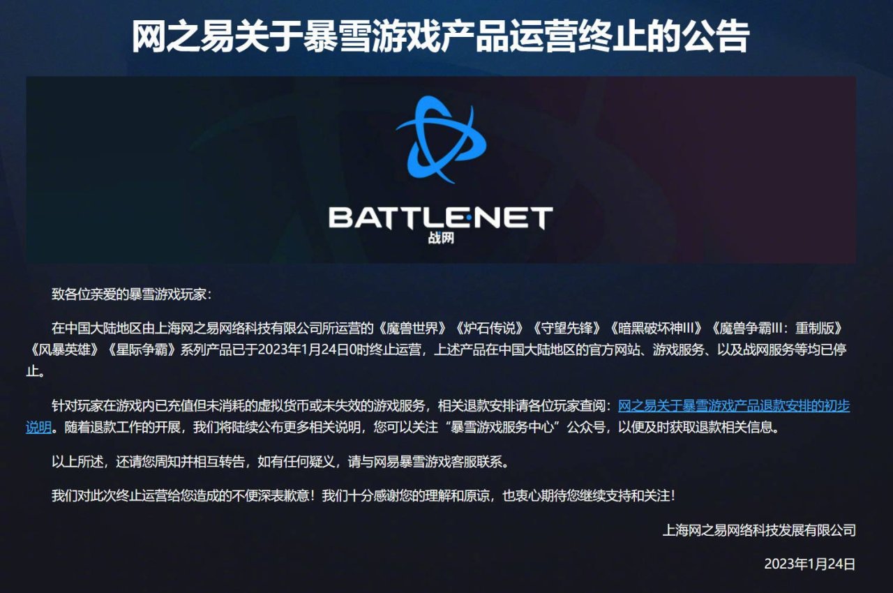 2023年1月24日0时,上海网之易正式发布关于暴雪游戏产品运营终止的公告,这代表着由上海网之易代理的《魔兽世界》《炉石传说》《守望先锋》《暗黑破坏神Ⅲ》《魔兽争霸Ⅲ:重制版》《风暴英雄》《星际争霸》等游戏产品在中国大陆市场的所有运营正式终止退出