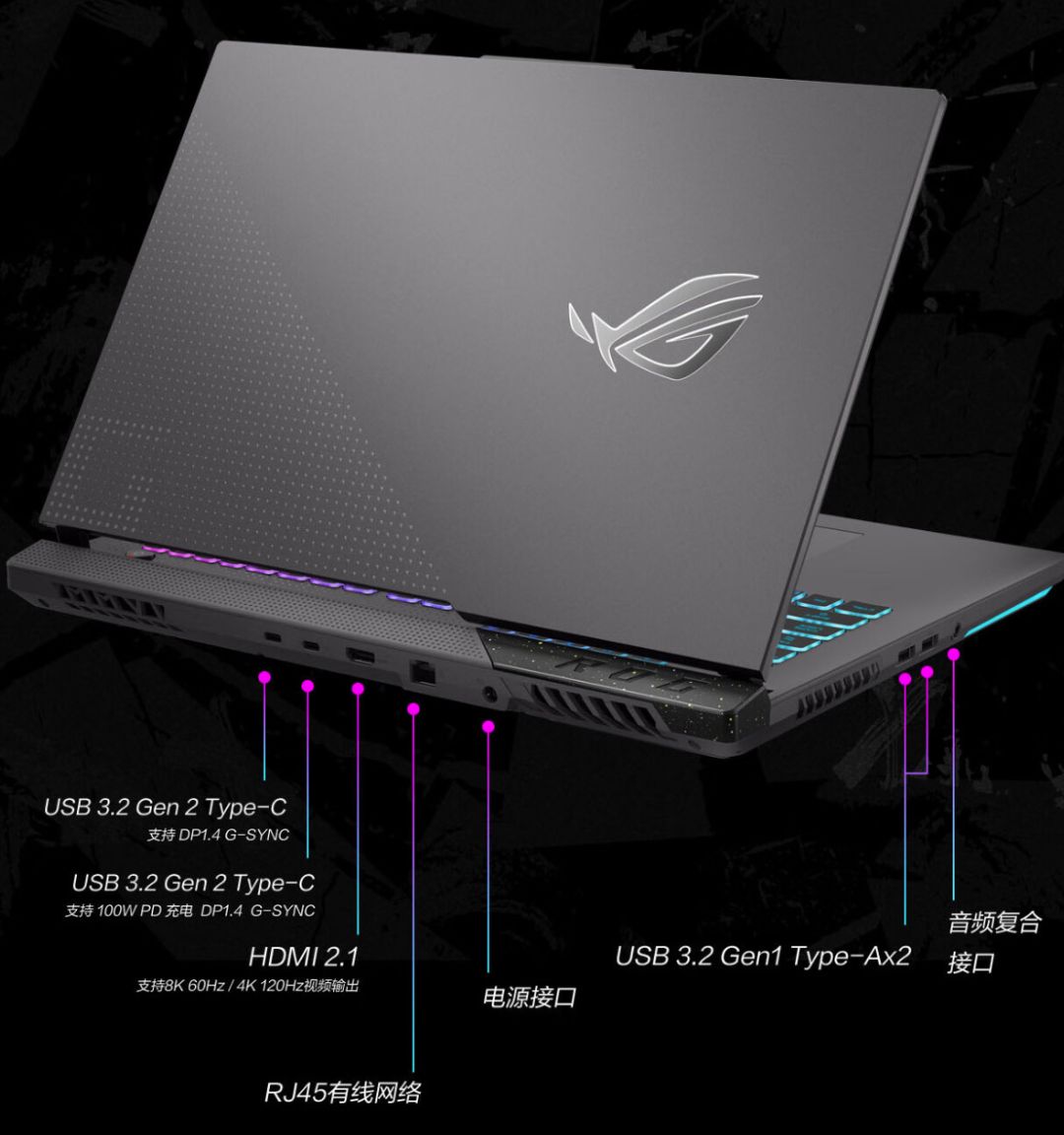ROG魔霸7 Plus拥有2个USB-C 3.2 Gen2、2个USB-A 3.2 Gen1、1个HDMI 2.1、1个RJ45、1个3.5mm接口。