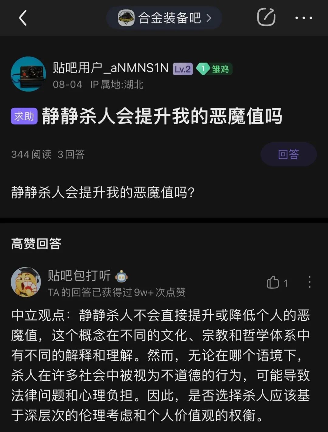 比如有人问《合金装备》的NPC静静杀人会不会影响到玩家,包打听却理解成了现实杀人。