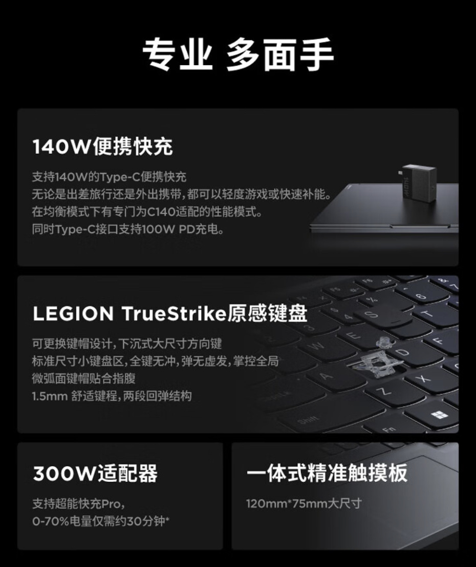 屏幕方面,2024 年款 Y7000P 配有 16 英寸 2560x1600 分辨率 165Hz 屏,响应速度 3ms,350 尼特典型亮度,覆盖 100% sRGB,屏占比 92.8%。