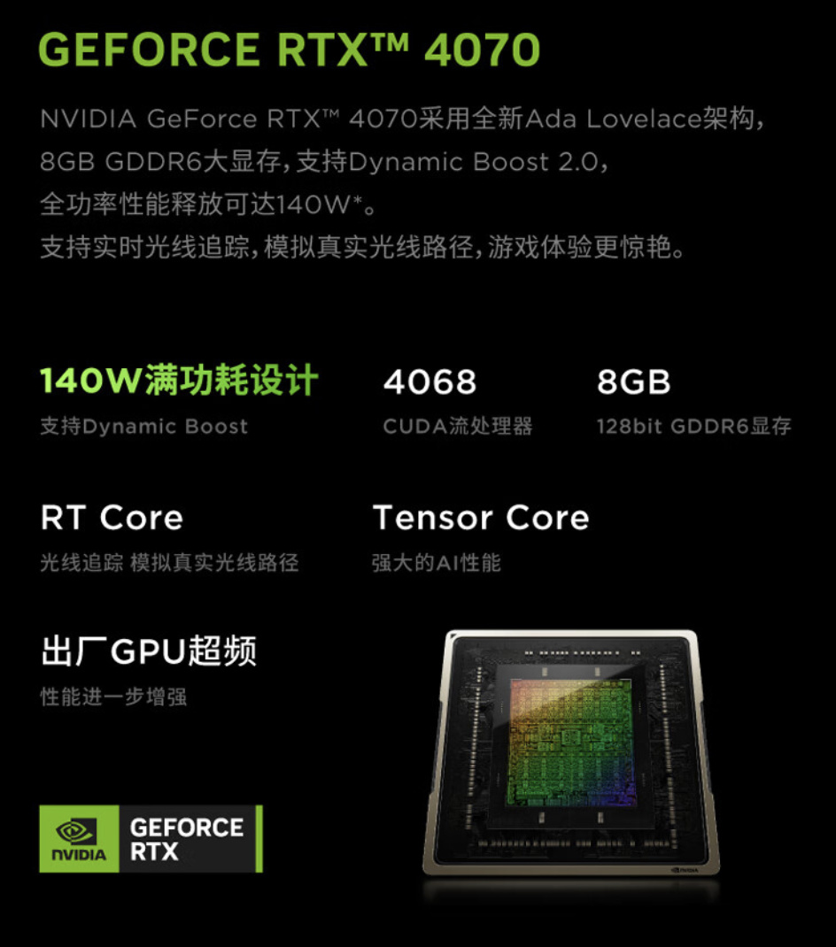 该笔记本配备 140 W“满血”RTX 4070 显卡,支持 Dynamic Boost 2.0,采用 4608 CUDA 流处理器,配备 8GB 128bit GDDR6 显存,支持出厂超频(野兽模式和超能模式下生效)。