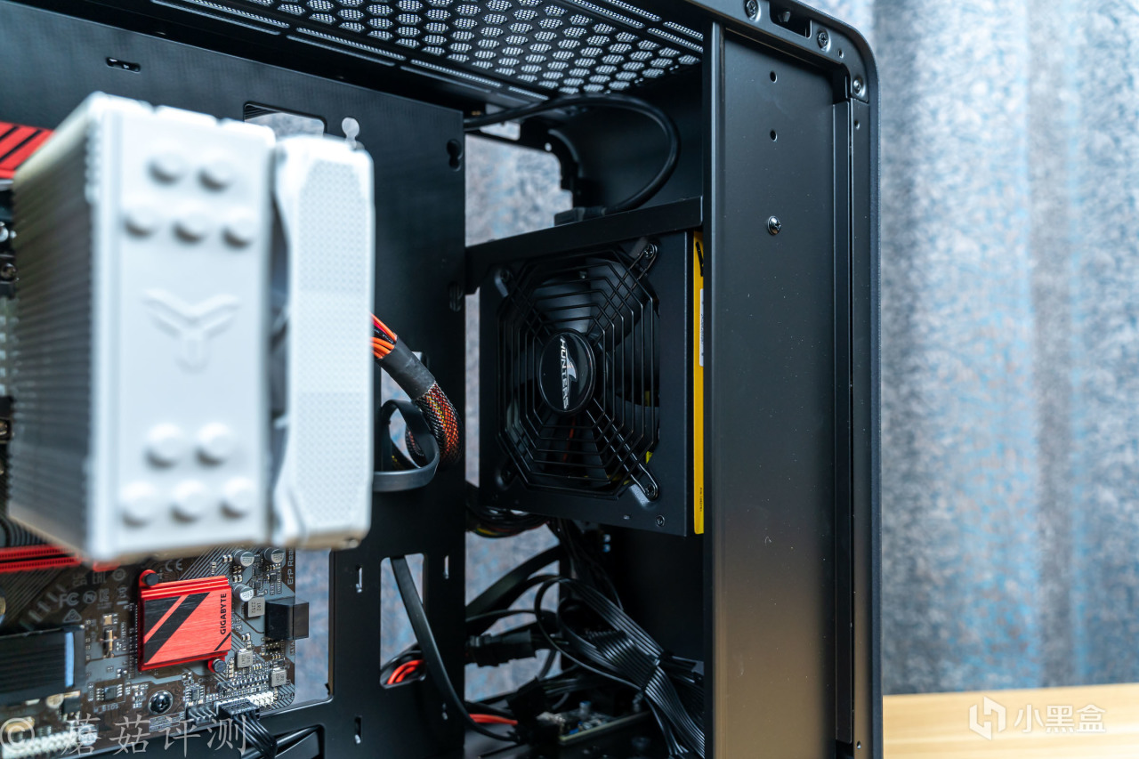 ▼电源轻松挂到机箱的前部,各种线材放在机箱的电源仓内。