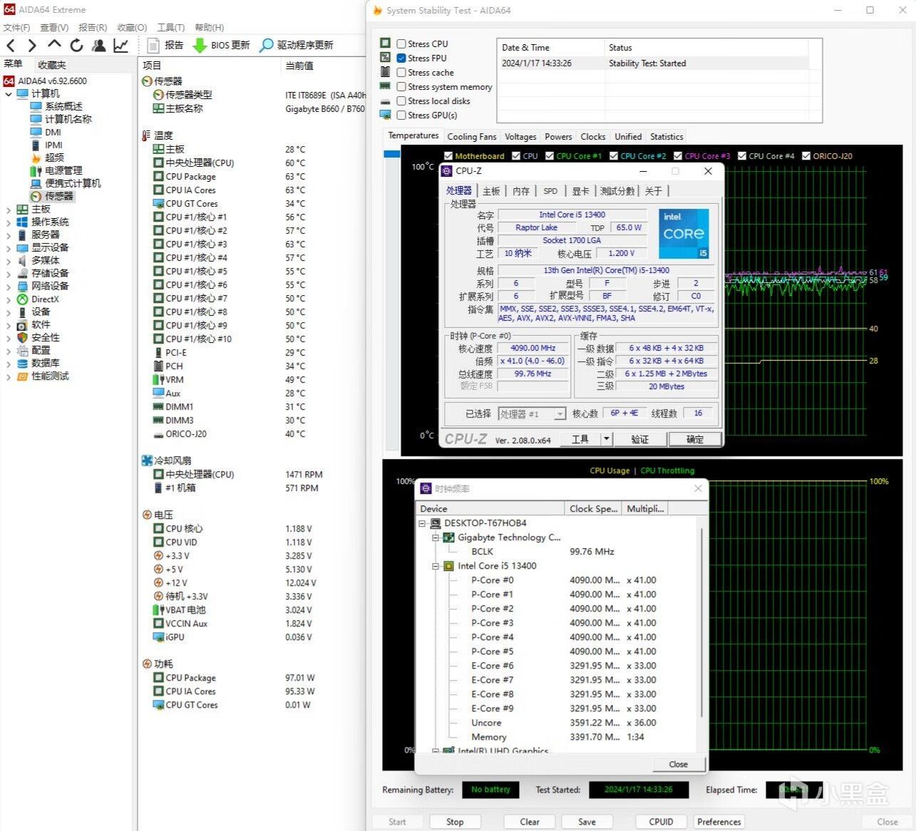 ▼单烤FPU测试,处理器功耗在100W左右,大核心睿频4.1GHz,小核心睿频3.3GHz,温度60℃,南桥34℃,供电49℃,固态40℃,整体散热情况表现不错。