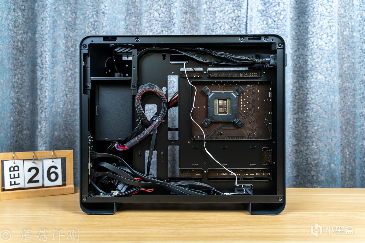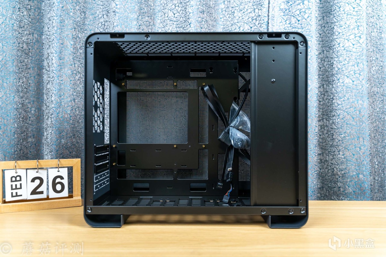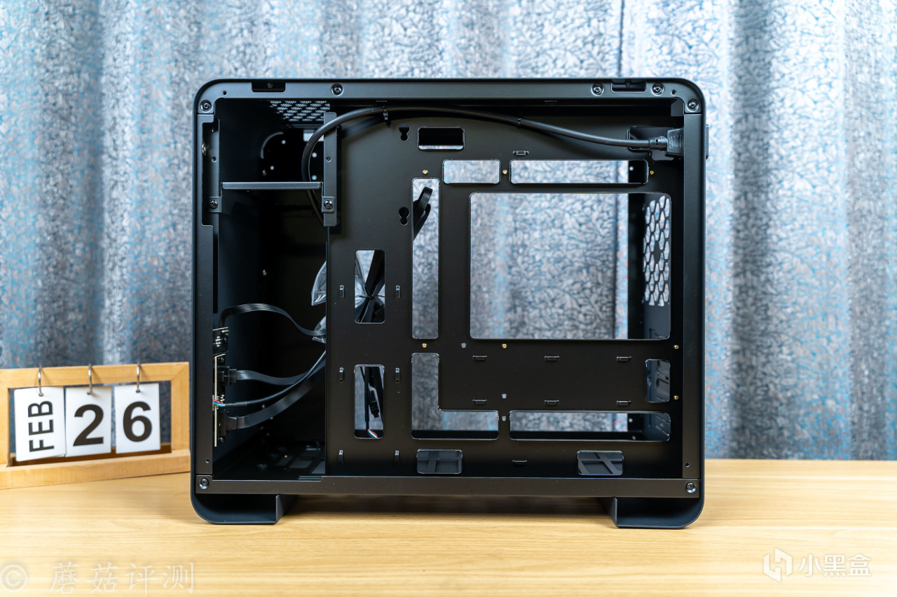 ▼机箱内部的空间设计很有意思,主板固定在左侧,电源挂在机箱的前部。