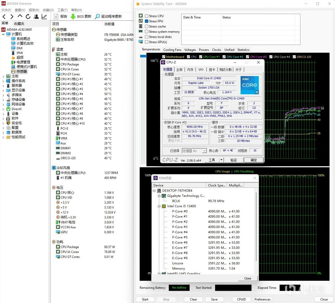 ▼简单跑个CPU-Z的压力测试,处理器功耗在85W左右,大核心睿频4.1GHz,小核心睿频3.3GHz,温度在52℃左右,南桥33℃,供电38℃,固态40℃。