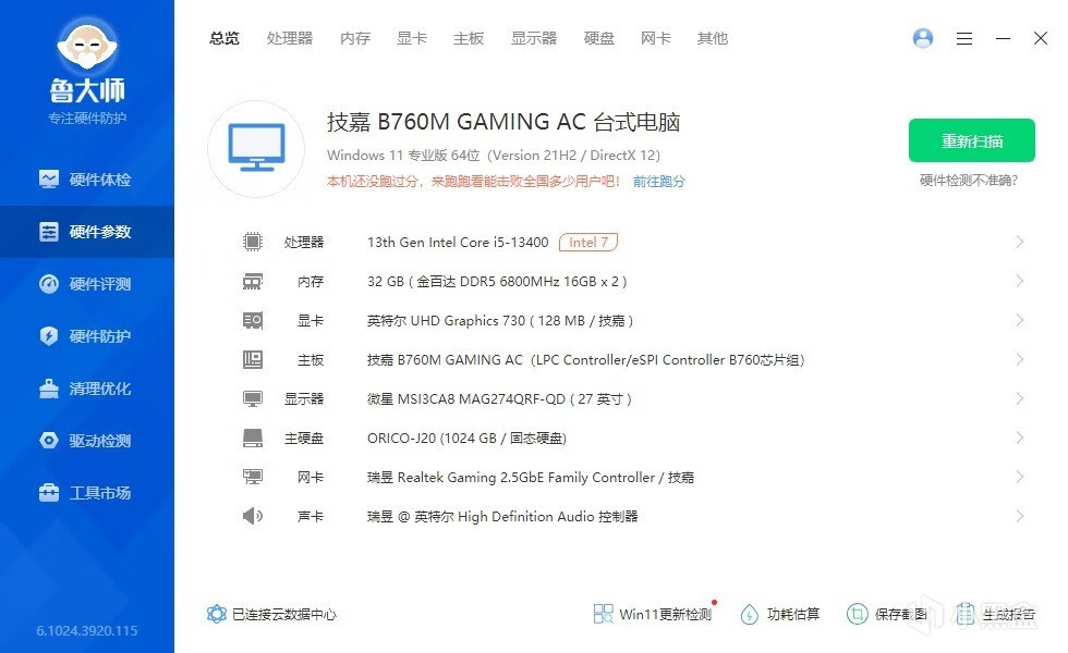 ▼整机配置一览,处理器是13400,主板是技嘉的B760M GAMING AC,内存是金百达的黑刃16GB*2 6800MHz。