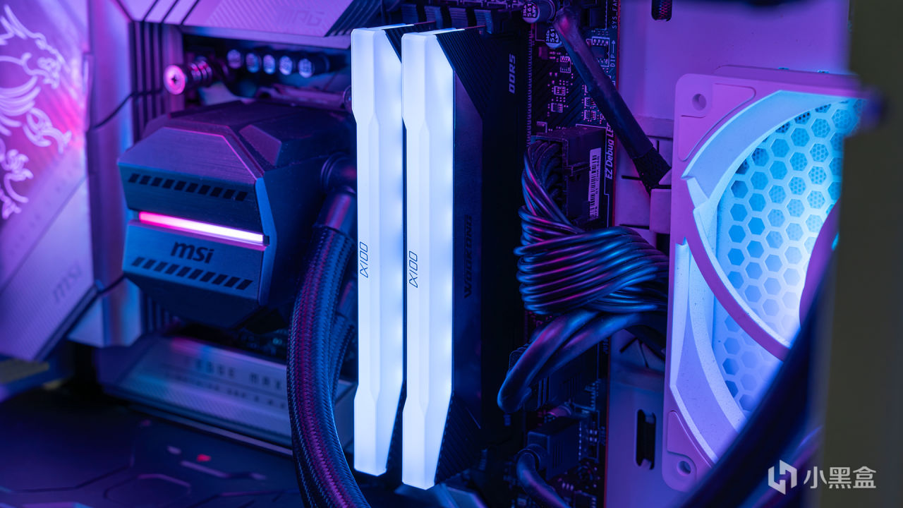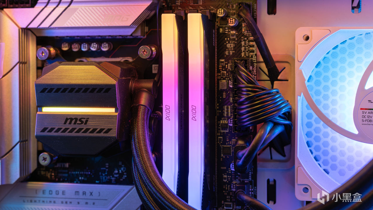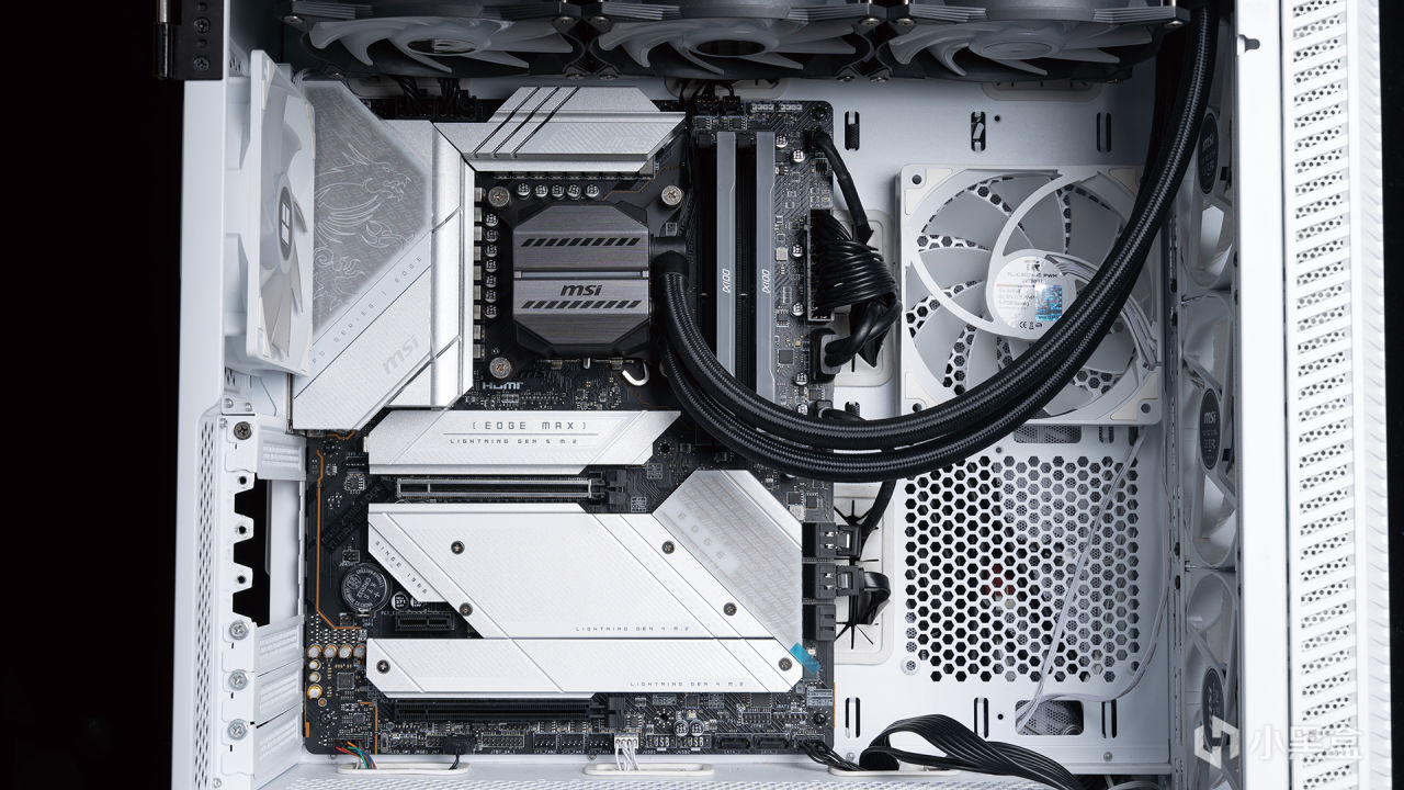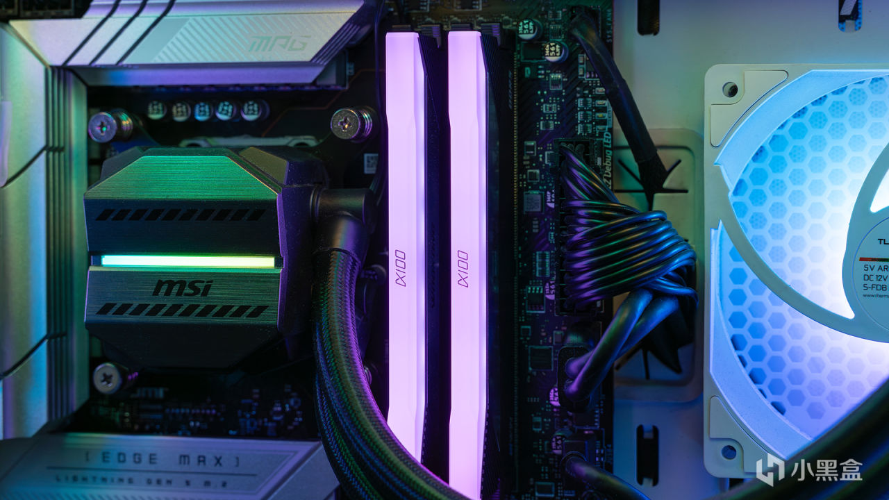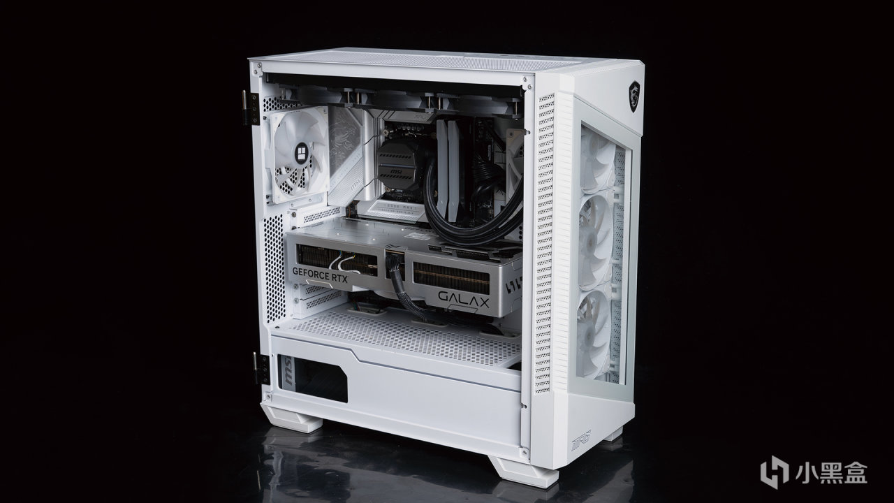 测试环境是安置在微星MPG VELOX刀锋100R白色这款机箱中进行,机箱采用前侧透明钢化玻璃设计,也属于海景房类别,在机箱前、侧、尾部总计安装了四个120mm风扇,上方是CPU的360水冷散热器,能够为测试保证良好的通风性。除此之外,机箱还拥有前置I/O的RGB控制按钮、内置多路ARGB接口等卖点。