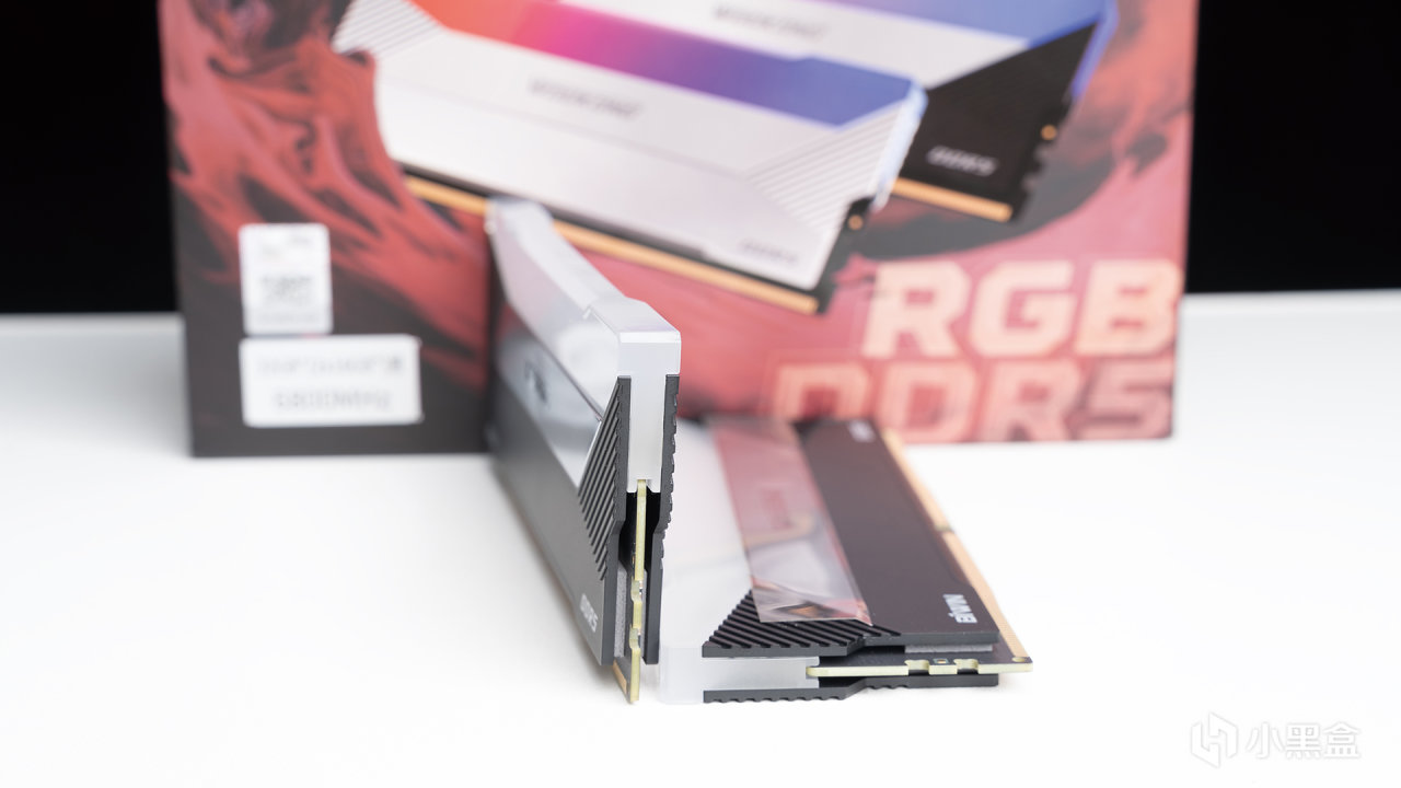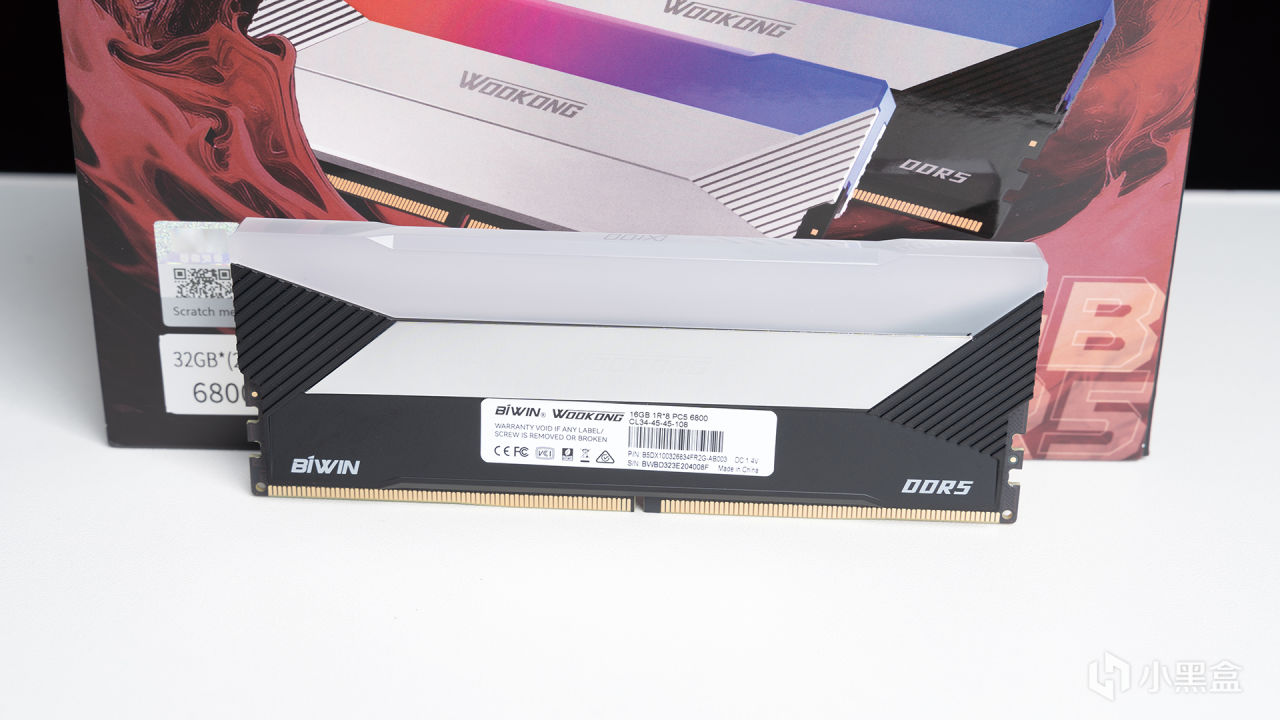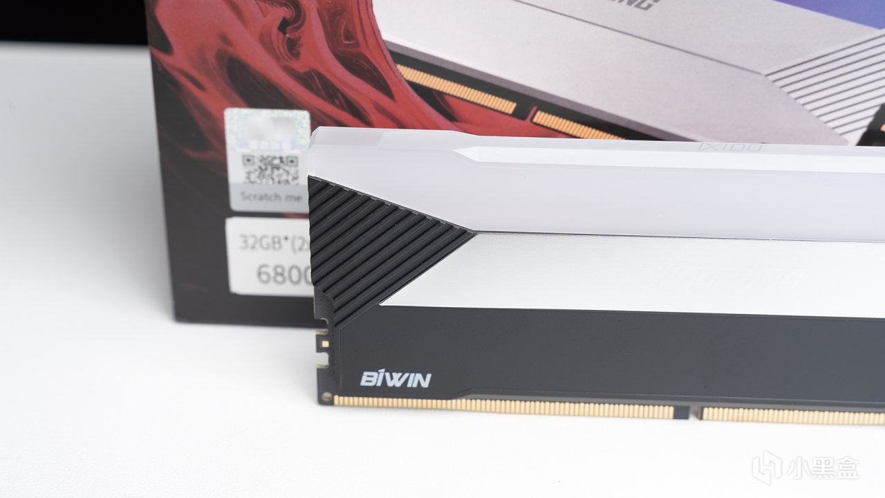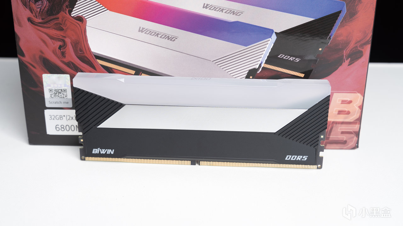 光直打到内存本体上,能看到中间区域明显呈现镜面特有质感,整体采用的是压铸铝合金散热装甲,在看不到的内部有高导热系数硅胶垫、电源IC散热加持,在超频时保证足够好的散热性能。正面角度来看,WOOKONG DX100其实可以分为RGB导光、镜面以及黑色金属三个区域,层次感直接拉满,左右下角还有BIWIN和DDR5 LOGO。