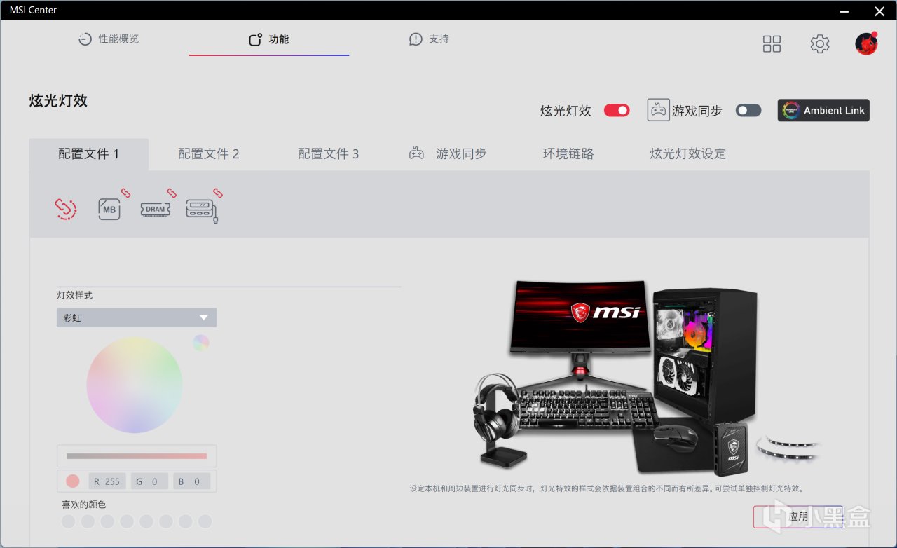 如果觉得预设RGB灯效还不过瘾,可以安装MSI Center来自定义更多灯效,使用起来也方便,灯效还能同步其他RGB硬件。