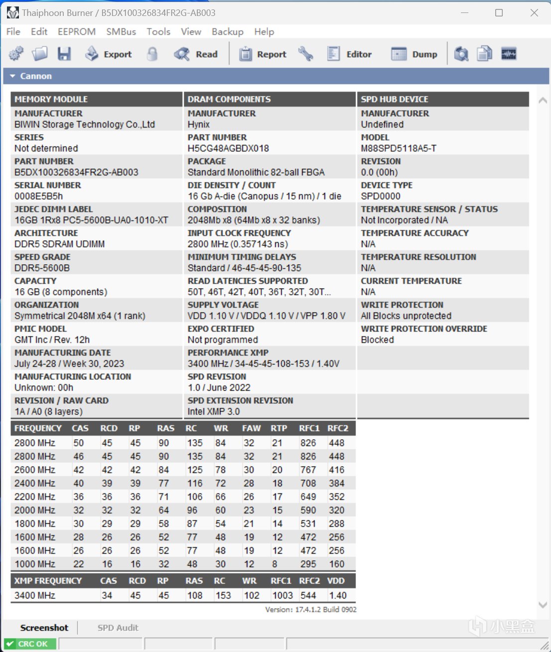 测试之前先用Thaiphoon Burner台风软件检测一下内存颗粒,确认WOOKONG DX100采用的就是海力士A-Die第二代颗粒(编码维H5CG48AGBDX018),是目前市面上最好的D5超频颗粒之一,和新M-die (3Gb)都属于第一梯队。