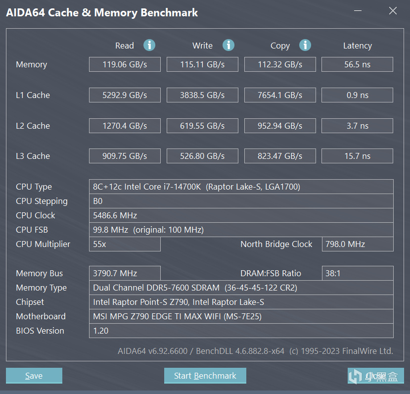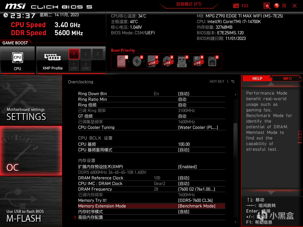上机测试第一时间直奔BIOS界面先超频一下吧,MPG Z790刀锋TI MAX目前已经支持Memory Try It!和Memory Extension Mode两大功能,结合起来用可以达到类似手动超频的效果,测试这颗Core i7-14700K属于大众体质,通过微星Memory Try It!可以自动超频至DDR5-7600C36基本盘,并开启Memory Extension Mode中的Benchmark Mode来进一步优化小参提升性能。