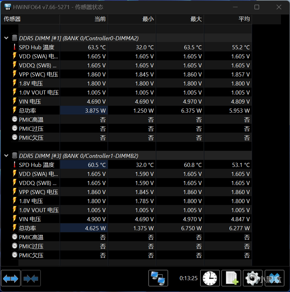 除此之外,为了验证内存的散热能力如何,这里特意把VDD和VDDQ加压到1.6V这种高强度(8000MHz频率极限烤机挺需要),在无风扇辅助封箱环境下,使用TestMem5烤机10分钟左右,HWiNFO软件显示两根内存温度最高分别为63.5℃、60.5℃,相比一般的散热马甲好太多了,当然如果是正儿八经烤机的话,还是建议加装辅助散热,能保证烤机过程中最大程度上不出现错误。
