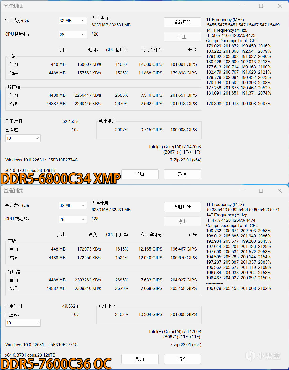 接下来是7-ZIP基准性能测试,相比上一代的13700K,14700K由于拥有更多数量的E核心,压缩和解压缩性能提升很明显,DDR5-6800这种常规XMP状态下已经可以远超13700K+DDR5-7600的组合,而手动再超频之后,压缩性能相比XMP状态达到9%之多,至于解压缩只有2%左右,主要还是依赖于核心规模。