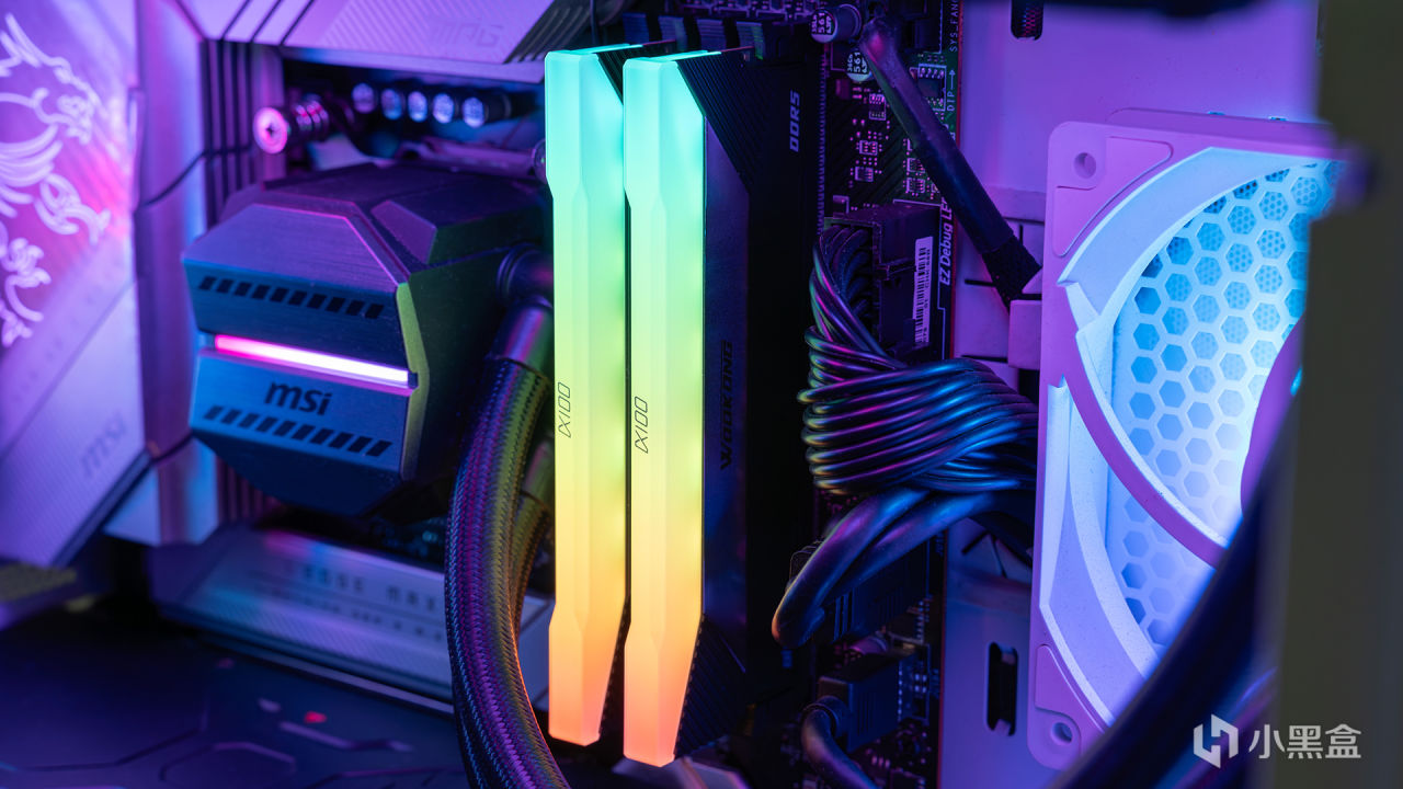 WOOKONG DX100内存通电的RGB效果,每种色彩之间过渡很自然,光效变化也丝滑,发光模组也足够大,很适合组建整套RGB主机。