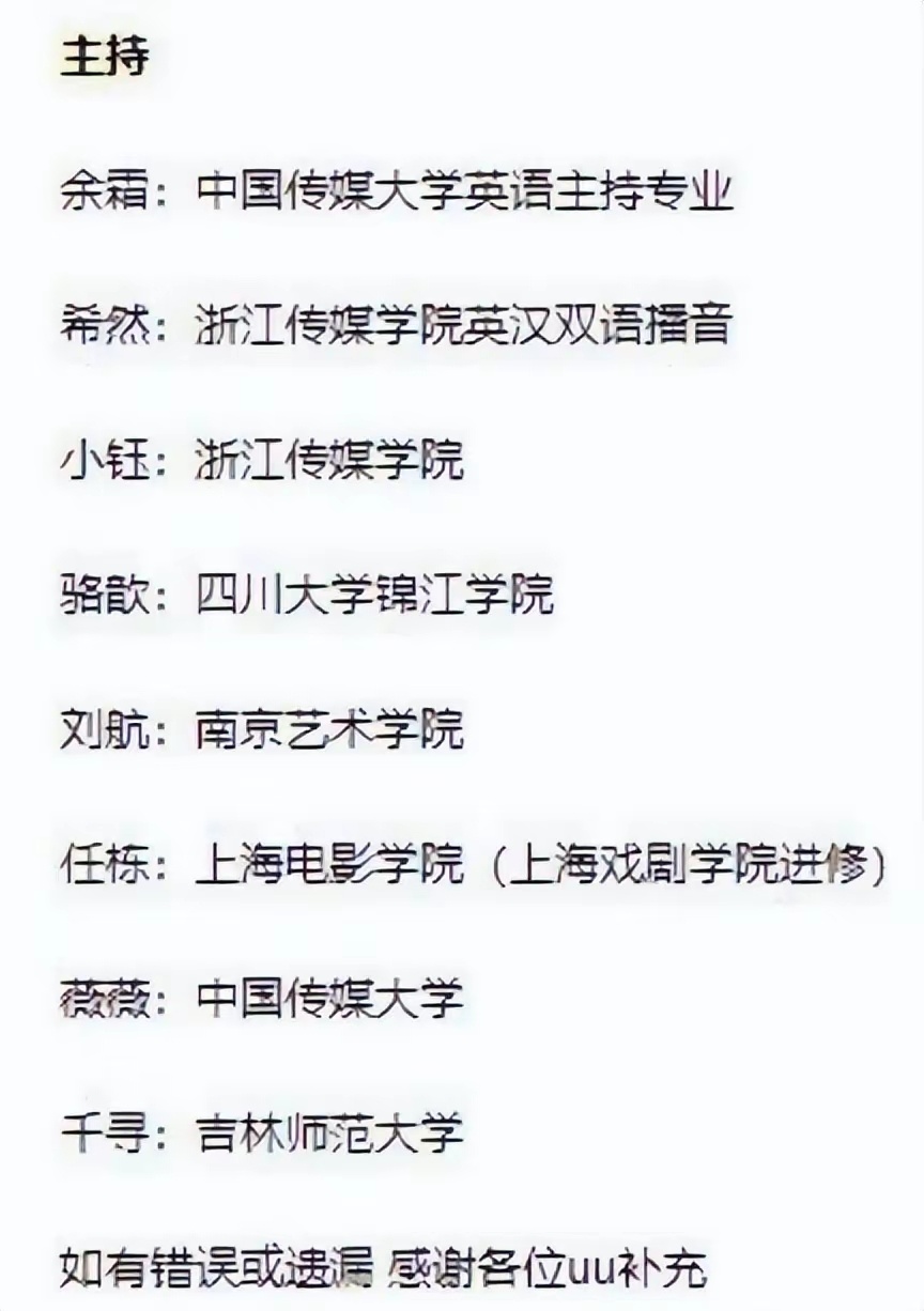 首先是Rita, 她是中戲畢業。然後是周淑怡,她是中專畢業,早年女團出道,**後加入遊戲風雲兼職主持人和解說,因爲是水龍事件辭職。然後是小鈺,她是浙江傳媒學院畢業,餘霜是中國傳媒大學英語主持專業,現在也是專業對口了,對此你們有什麼想說的嗎?