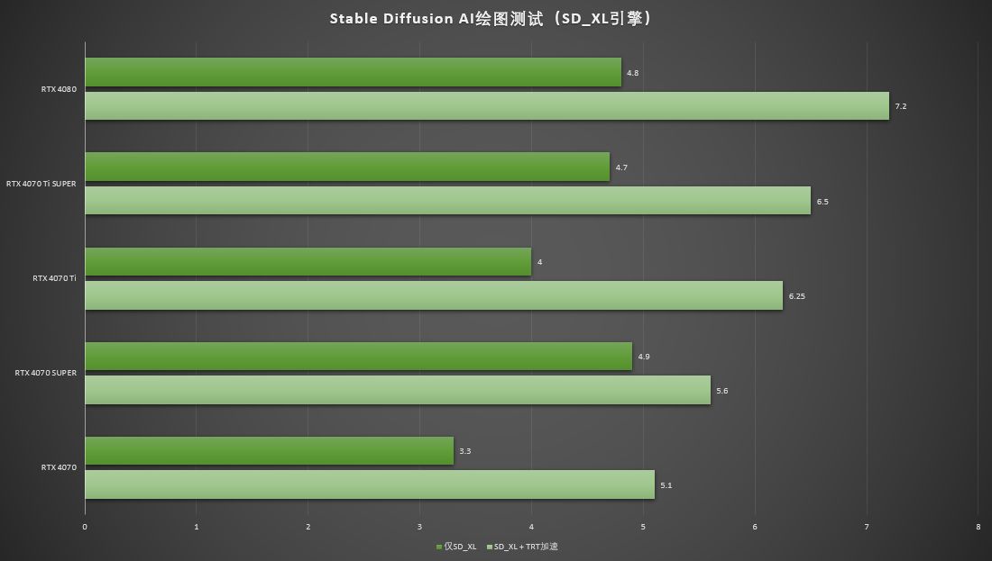 开启TRT加速时, RTX 4070 Ti SUPER的AIGC速度是RTX 4070 Ti的108.5%,是RTX 4080的97.8%。