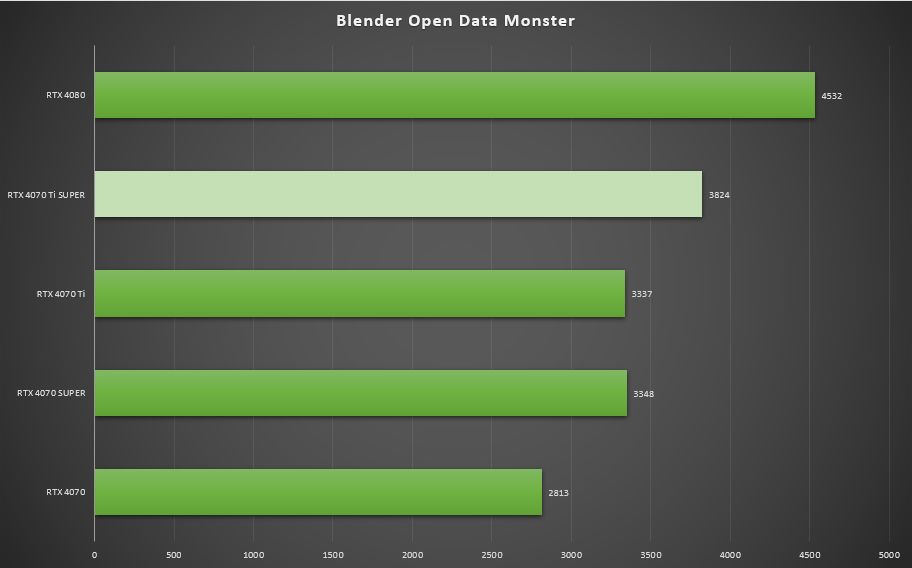 ▲在Blender Open Data Monster中,七彩虹iGame GeForce RTX 4070 Ti SUPER Neptune得分3824,是RTX 4070 Ti得分3337的115%,是RTX 4080 得分962的84.4%。