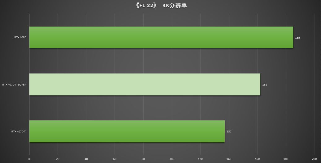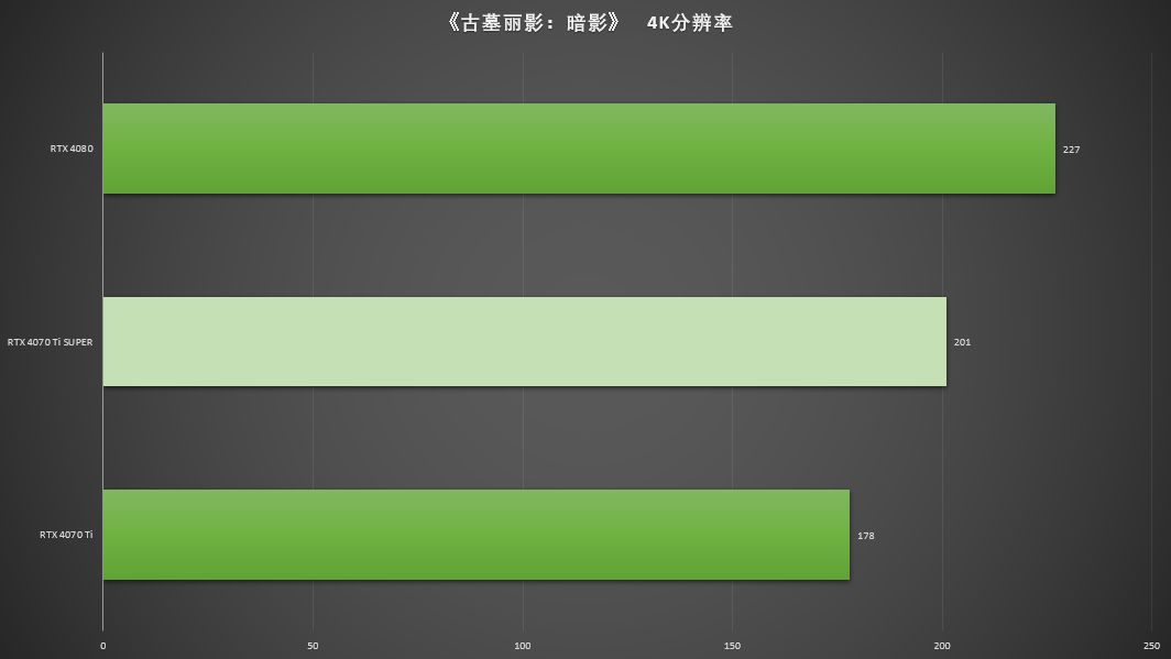 在测试中,RTX 4070 Ti所获的201 FPS是RTX 4070 Ti 平均帧率178 FPS的112.9%,是RTX 4080 平均帧率227 FPS的88.5%