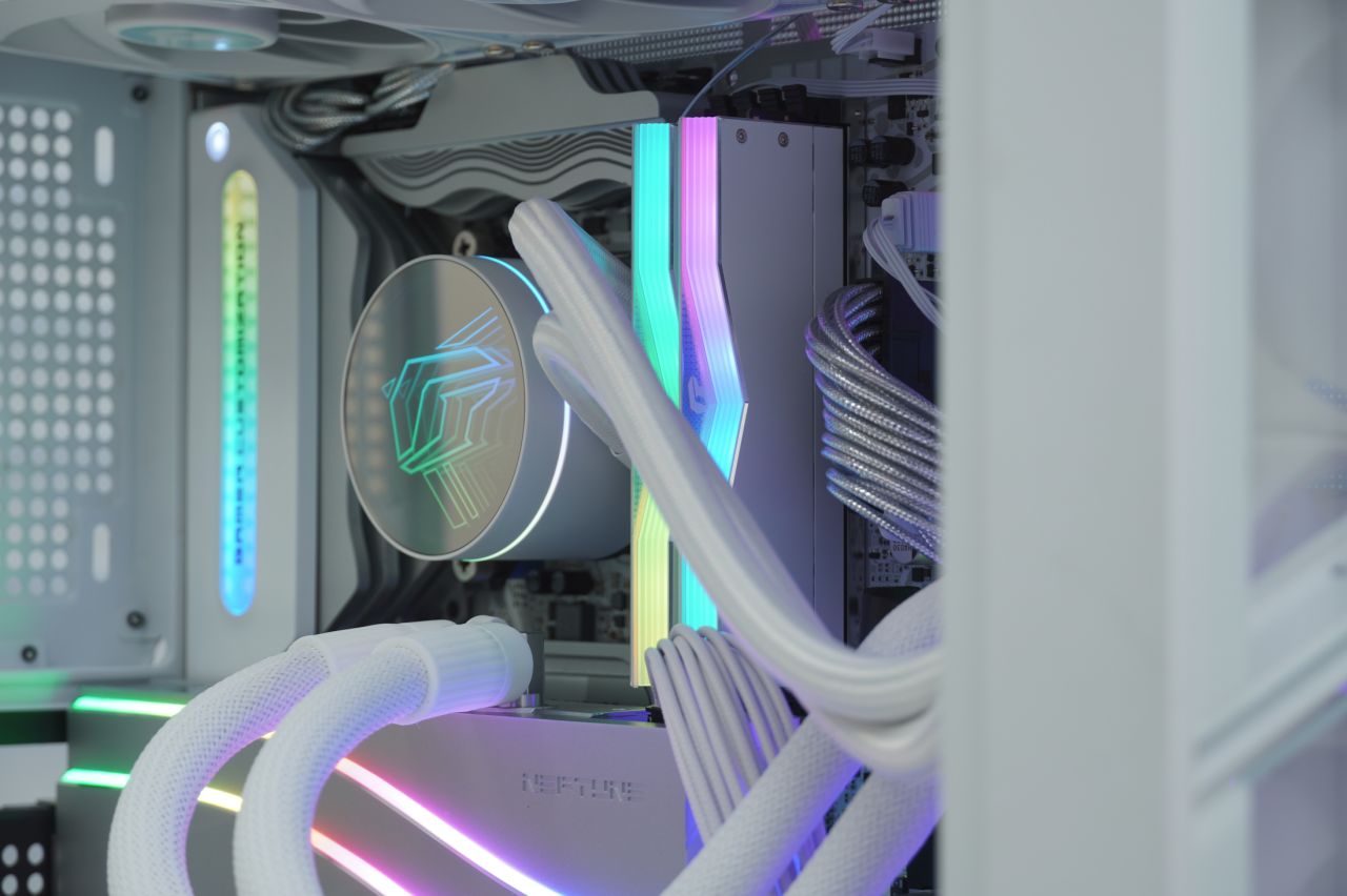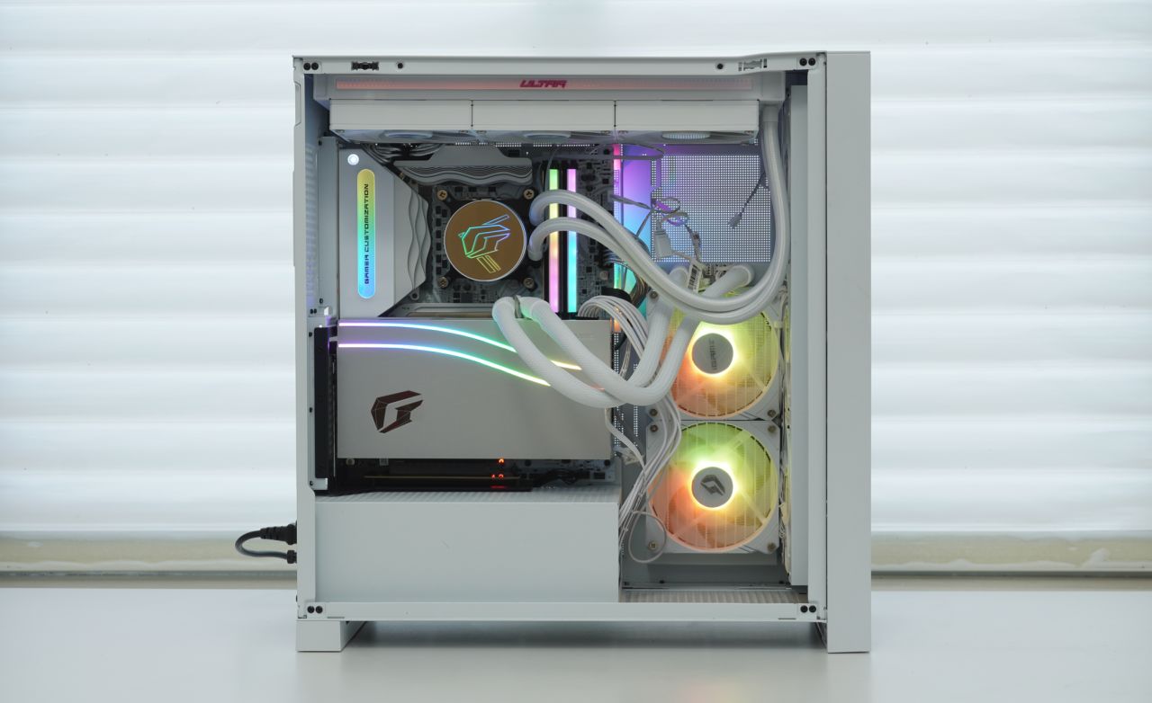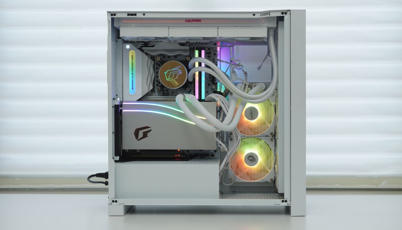 ▲iGame LQ360 Ultra W采用了“深渊镜”ARGB灯效凸显iGame LOGO,侧边有额外同步灯圈设计,风扇也采用了Ultra家族产品线专属的饰条。水冷采用了纯铜底座、可提供3000R澎湃动力的9极高速马达与加密型的360水排,散热性能也十分优秀,实测可以为不手动超频的i9-14900K提供充足的散热能力。