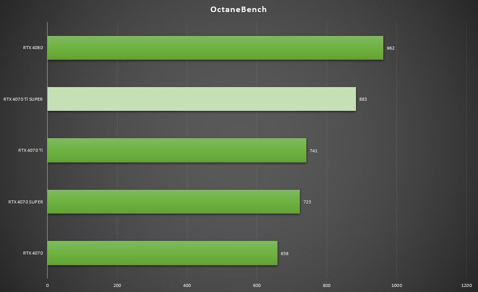 ▲在OctaneBench中,七彩虹iGame GeForce RTX 4070 Ti SUPER Neptune得分883,是RTX 4070 Ti得分741的119.2%,是RTX 4080 得分962的91.8%。