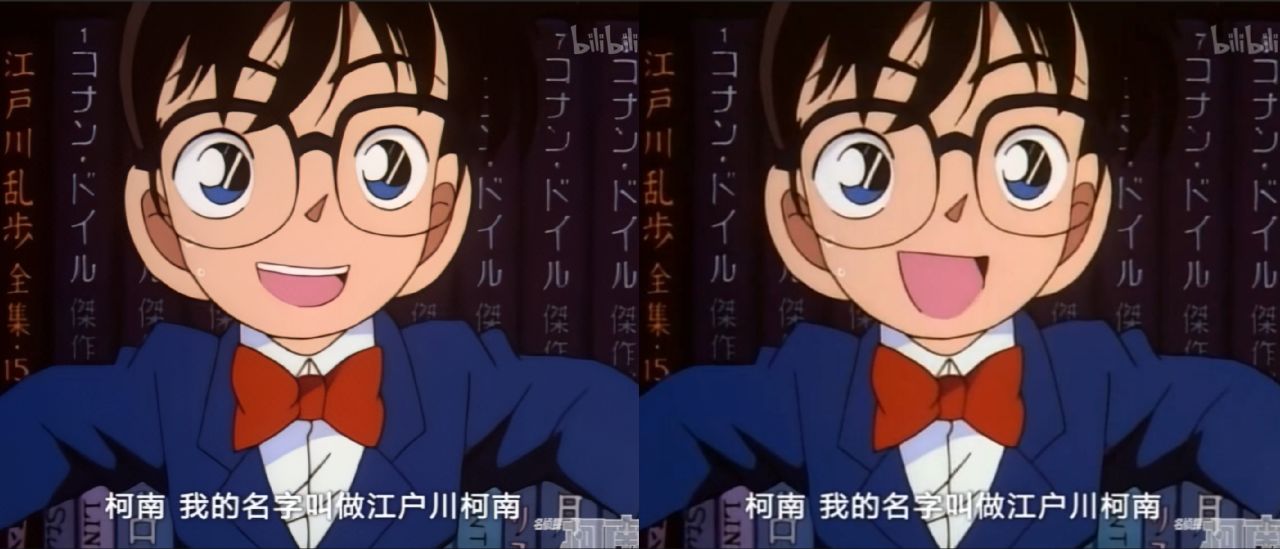 ▲RTX VSR支持流媒体播放,最新版本的CHROME浏览器以及最新版本的EDGE浏览器中均已支持RTX 视频超分辨率技术。我在B站上播放了《名侦探柯南》的第一季,分辨率均为480P,左侧为“RTX 视频增强”开启,右侧为“RTX 视频增强”关闭时,可见左侧画面的清晰度明显优于右侧画面。