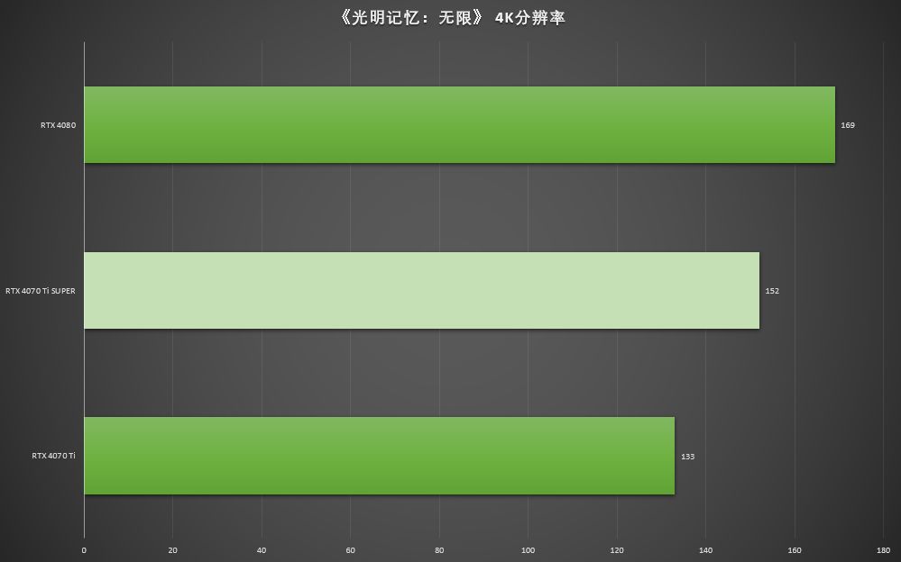 ▲在《光明记忆:无限》最高画质,光追最高,4K分辨率,DLSS 3开启下,七彩虹iGame GeForce RTX 4070 Ti SUPER Neptune能够提供152 FPS的平均帧率,是RTX 4070 Ti 平均帧率133 FPS的114.3%,是RTX 4080 平均帧率169 FPS的89.9%。