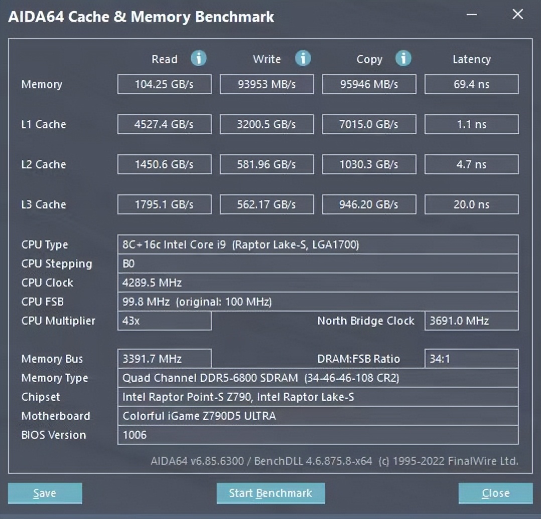 ▲经实测,其在XMP频率与时序下,iGame 16G*2 6800 Ultra W内存读取速度为104.25 GB/s,写入速度为93953 MB/s,复制速度为 95946 MB/s,延迟为69.4 ns,整体表现很优秀了。