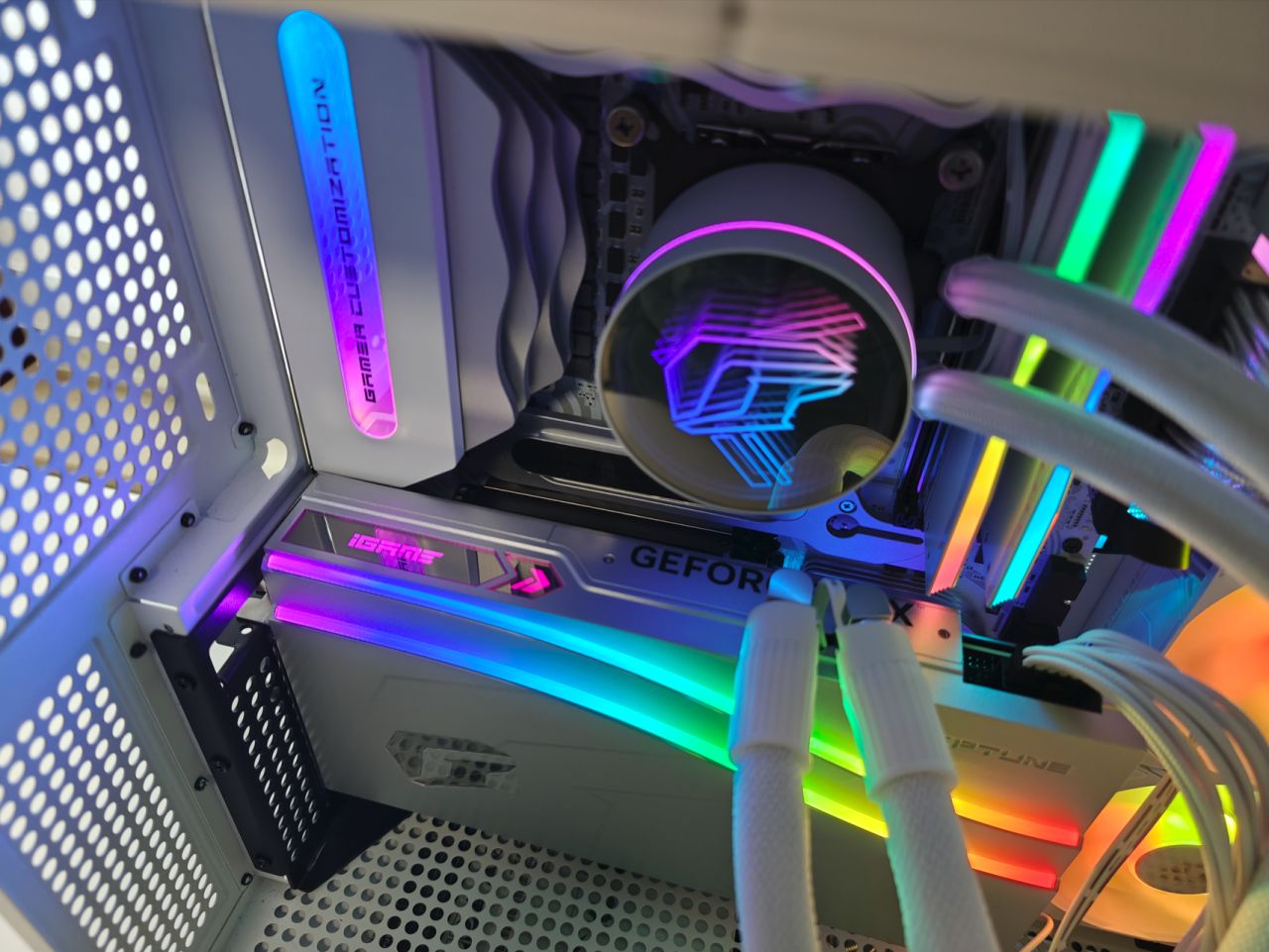 ▲其中,iGAME CUSTOMIZATION与FLOW均有ARGB背光,其上颜色像水流一样缓缓流动变换,十分符合FLOW这个词的含义。(FLOW灯条处基本会被显卡盖住,除非使用水冷显卡才能露出此处灯效)