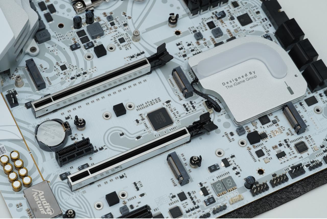 ▲拓展性方面,iGame Z790D5 FLOW提供了1个PCIe 5.0x16显卡插槽与1个PCIe 4.0x16显卡插槽,两个显卡插槽均有金属装甲加固,用两块高端显卡组交火也丝毫不虚,储存方面,则有 4个PCIe 4.0 M.2 NVMe接口。