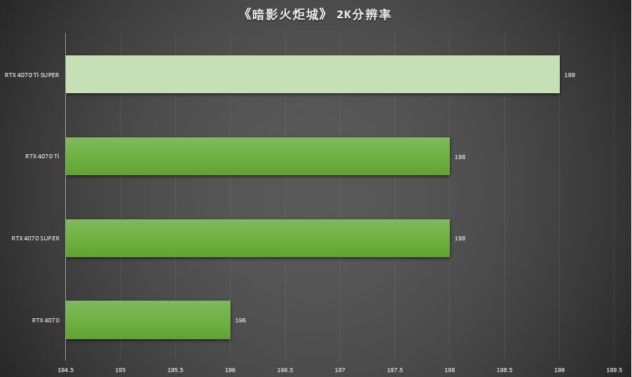 ▲在《暗影火炬城》最高画质,光追开启,2K分辨率,DLSS 3开启下,七彩虹iGame GeForce RTX 4070 Ti SUPER Neptune能够提供199 FPS的平均帧率,RTX 4070 Ti 平均帧率198 FPS,几块显卡的平均帧率都十分接近,感觉是这款游戏锁了帧率上限200 FPS?