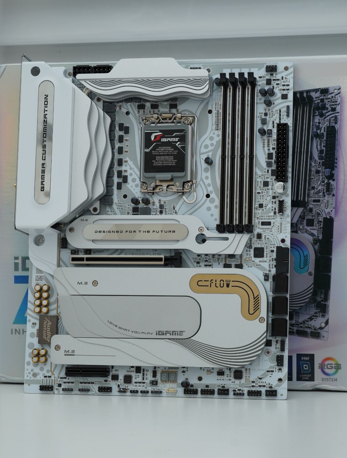 ▲在主板的几块散热装甲上,分别印有GAME CUSTOMIZATION(游戏定制化),DESIGNED FOR FUTURE(为未来设计),FLOW(流体)字样,可以说是信仰满满。