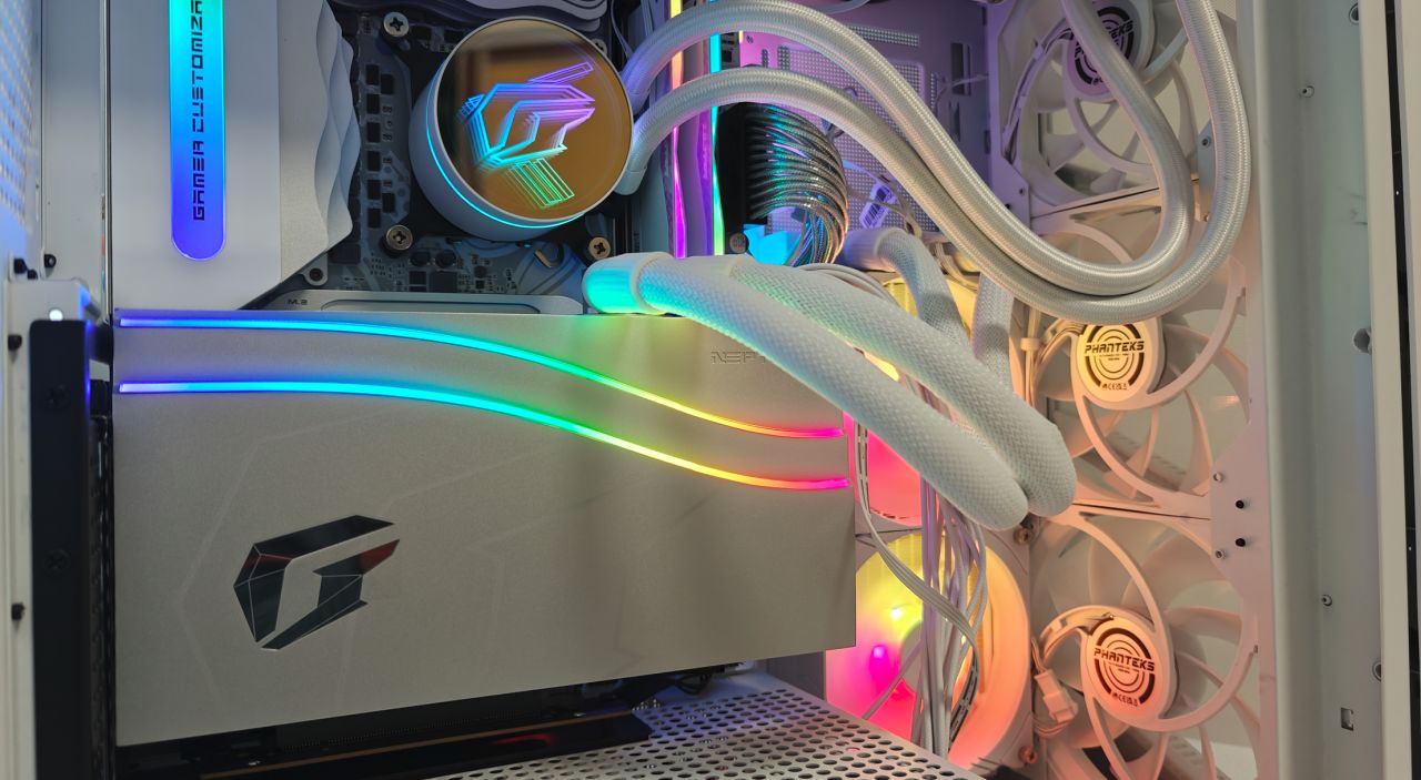 ▲我这里用的是鑫谷昆仑 御风机箱并搭配显卡延长线进行显卡竖装,显卡顶部拥有两个灯,透过玻璃隐约能够看到iGame的英文与图形LOGO,信仰无处不在。侧面模拟水流的ARGB灯则使本无风扇在显卡主体看上去有一种静谧流淌,潺潺流动的动感,灯光亮起来那一刹那,显卡就“活”了。
