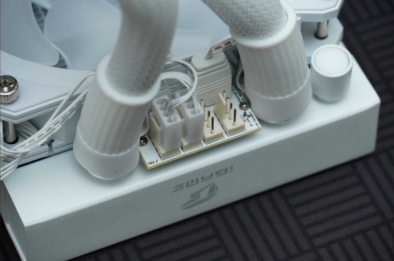 ▲采用240冷排的冰海散热器拥有2个120mm静音风扇,中左右两个则印有iGame图形LOGO与英文LOGO,也是信仰满满,而且冷排上拥有着风扇集线器,方便玩家自由更换风扇。