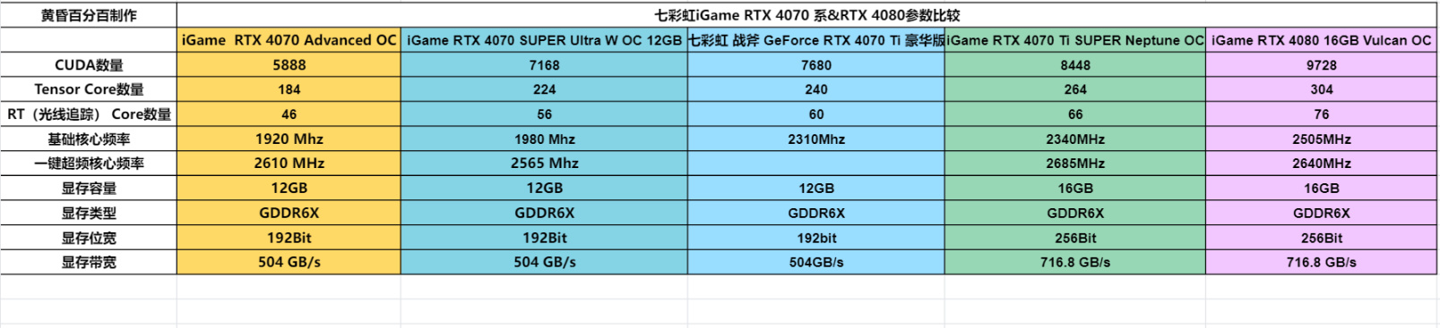 ▲除了新测试的数据之外,本文还会引入之前测试RTX 4070 SUPER时的获得的七彩虹iGame GeForce RTX 4070 SUPER Ultra W OC 12GB与iGame GeForce RTX 4070 Advanced OC显卡在2K分辨率下的游戏测试与生产力测试的数据。