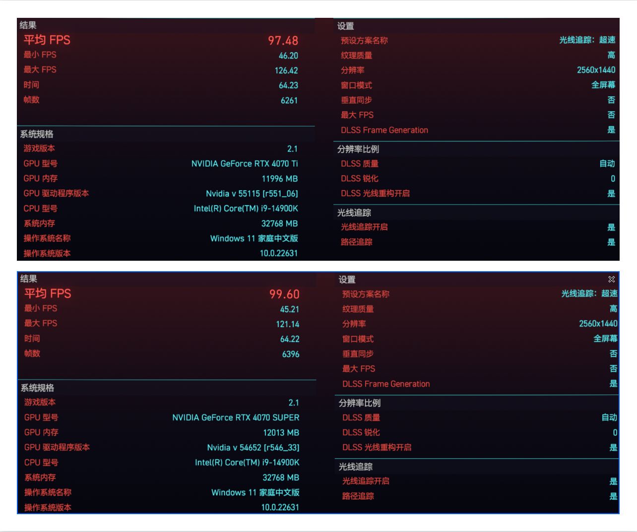 ▲《赛博朋克2077》一直走在支持新显示技术的最前沿,其是最早支持英伟达光线追踪:超速(Overdirve)画质的游戏之一,也是最早支持DLSS 3.5,DLSS 光线重构功能的游戏之一,我们会使用其内置的Benchmark进行测试,我分别在2K与4K分辨率下测试了游戏预设的光线追踪:超速(Overdirve)与光线追踪:超级这两组画质。