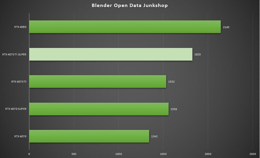 ▲在Blender Open Data Junkshop中,七彩虹iGame GeForce RTX 4070 Ti SUPER Neptune得分1825,是RTX 4070 Ti得分1532的119.1%,是RTX 4080 得分2145的85.1%。