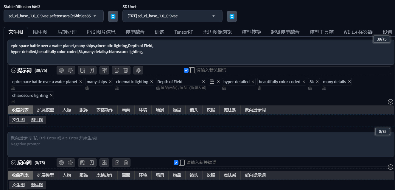 ▲我们首先使用SDXL Turbo模型并提供Tensor RT加速,测试的提示词为:epic space battle over a water planet, many ships, cinematic lighting, Depth of Field, hyper-detailed, beautifully color-coded, 8k, many details, chiaroscuro lighting。