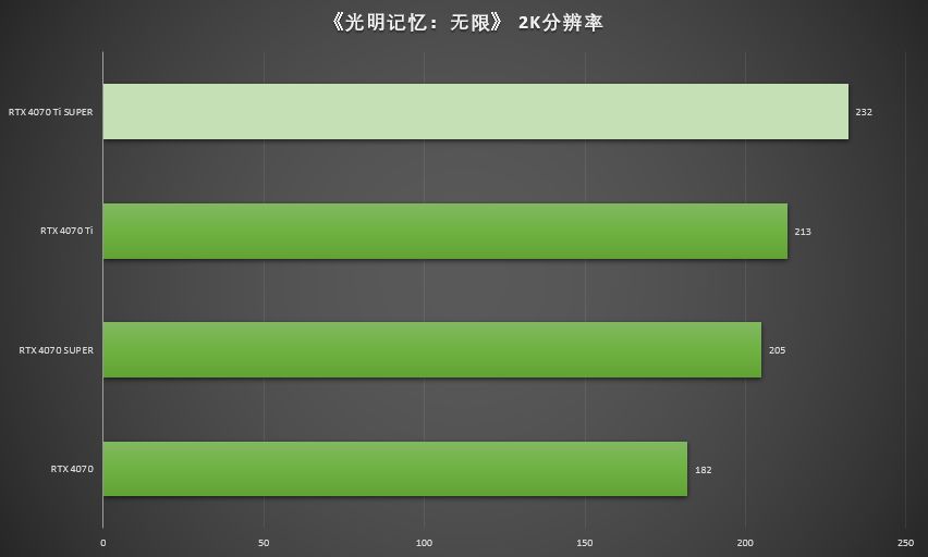 ▲在《光明记忆:无限》最高画质,光追最高,2K分辨率,DLSS 3开启下,七彩虹iGame GeForce RTX 4070 Ti SUPER Neptune能够提供232 FPS的平均帧率,是RTX 4070 Ti 平均帧率213 FPS的108.9%,两块显卡都比较适合搭配2K 240Hz或2K 260的显示器进行游玩。