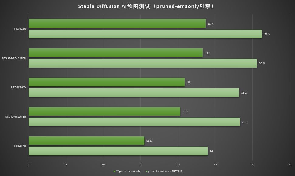 而不开启TRT加速时, RTX 4070 Ti SUPER的AIGC速度是RTX 4070 Ti的111.5%,是RTX 4080的98.3%。