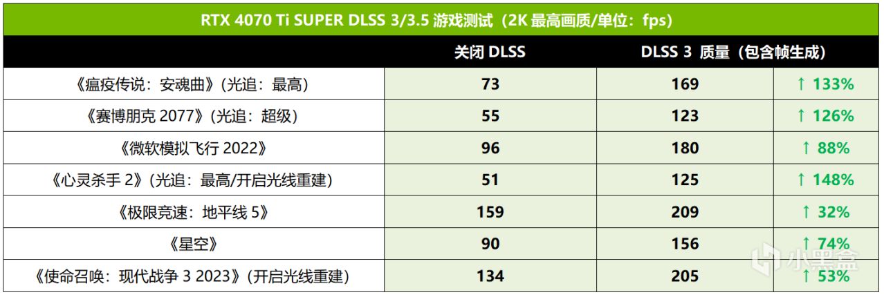 DLSS 3/3.5是RTX 40系列独享的黑科技,可以为RTX 40 GPU带来巨大的游戏帧率提升。从实测可以看到,在开启DLSS 3/3.5之后,RTX 4070 Ti SUPER的游戏帧率最高提升幅度高达148%,多数游戏提升幅度都接近甚至达到了翻倍,能让低于平均60fps的光追游戏大作帧率瞬间提升到100fps以上,效果可以说相当给力,因此建议玩家在游戏中一定要打开DLSS 3/3.5的支持。