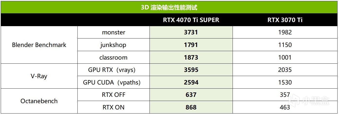 如果和RTX 3070 Ti相比的话,那RTX 4070 Ti SUPER的生产力性能堪称质的飞跃。在3D渲染输出性能方面,RTX 4070 Ti SUPER最高领先RTX 3070 Ti大约88%,平均领先幅度可达77%。如果渲染器还支持DLSS 3/3.5,RTX 4070 Ti SUPER领先的幅度还能提升数倍之多(参考前面D5渲染器测试)。