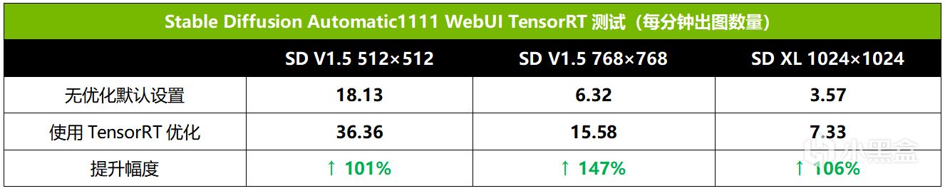 在使用NVIDIA TensorRT优化后,RTX 4070 Ti SUPER在Stable Diffusion V1.5的512×512出图测试中提升幅度超过101%,768×768出图测试中提升幅度接近150%。Stable Diffusion XL出图测试中,提升幅度也高达106%,可见NVIDIA TensorRT效果相当给力。