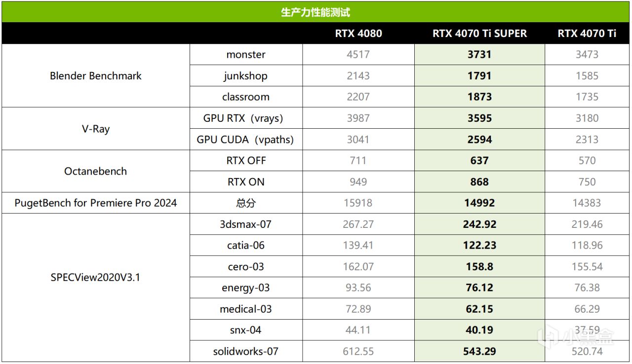 RTX 4070 Ti SUPER不但GPU规格相对RTX 4070 Ti明显升级,而且显存位宽也提升到了256bit,容量增加到了16GB,因此在生产力性能方面也会有更强的表现。从实测来看,在Blender中,RTX 4070 Ti SUPER最高可领先RTX 4070 Ti大约12%,在V-Ray中最多可领先大约13%,Octanebench中最多可领先约16%,总体来看在3D渲染方面RTX 4070 Ti SUPER领先RTX 4070 Ti的幅度甚至还高于游戏领先幅度。SPECView测试中,RTX 4070 Ti SUPER领先RTX 4070 Ti的幅度最高可达10%,也比较复合理论数据。